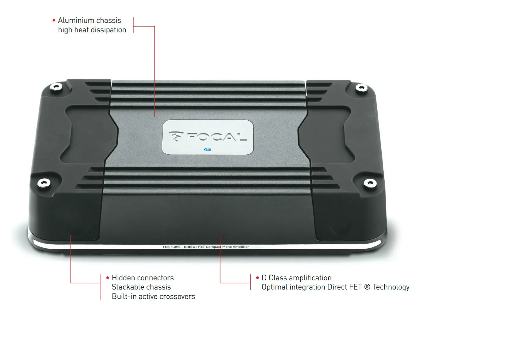 You'll find plenty of controls to make your bass sound perfect, including a variable low-pass filter, switchable bass boost, and variable phase adjustment. Focal's Direct FET® Technology keeps the amp's aluminum chassis so cool, you can stack it with another FDS Series amp, like the 4-channel FDS 4.350, to power an entire system from one slick-looking power station.