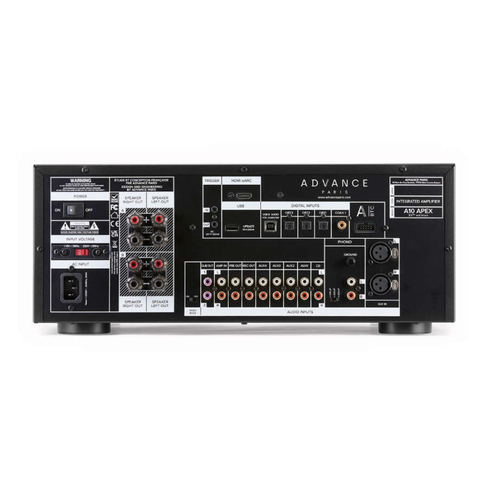 Advance Paris A10 APEX - legendinio A10 Classic evoliucija, sukurta ieškantiems tikro Hi-Fi skambesio. Šis hibridinis integruotas stiprintuvas sujungia lempų šilumą ir tranzistorių galią, todėl skamba šiltai ir aiškiai. Jis turi 2 × 130 W galią (8Ω) , integruotą patefono (MM) įėjimą ir HDMI eARC televizoriui prijungti. Tinka tiek muzikai, tiek namų kino sistemai.