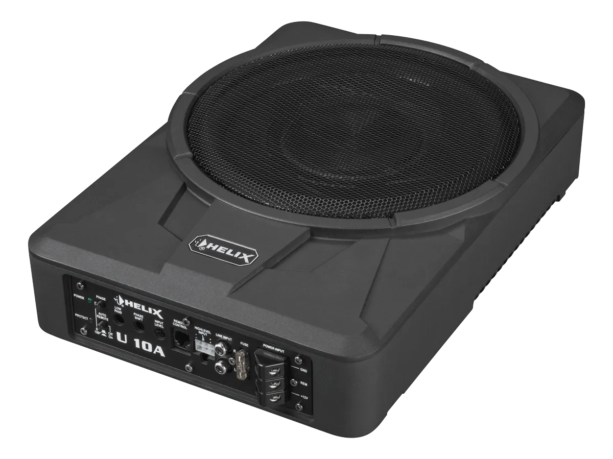 Bass is in the smallest hut –If mounting space in the vehicle is scarce and existing car hifi systems badly need the "extra kick" in the low frequency range without great effort, the new HELIX active subwoofers U 10A and U 8A are the right choice . Driven by powerful, integrated Class AB amplifiers with 180 W RMS, the heavy-duty drivers with their rock-solid aluminum cones and heat-resistant voice coils easily transform the amplifier power into punchy bass. Thanks to comprehensive setting options like the adjustable, high-slope lowpass filter and particularly sensitive phase control, the low frequency reproduction can be perfectly adapted to the acoustic conditions inside the vehicle. Equipped with a 2-channel high-level input with automatic turn on function as well as a 2-channel low-level RCA input a seamless integration is guaranteed. And thanks to the especially shallow cabinet design, the installation will be a no-brainer, especially if space is extremely limited – these small "bass boosters" may even fit under the seats, for example.