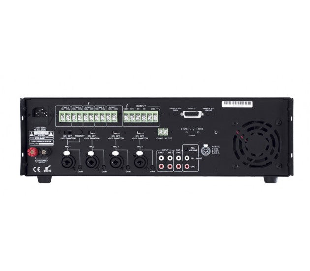 - Inputs: 4x mic (XLR/Jack combo) + 2x line (RCA) + 1x phone (RCA) + emergency (RCA)