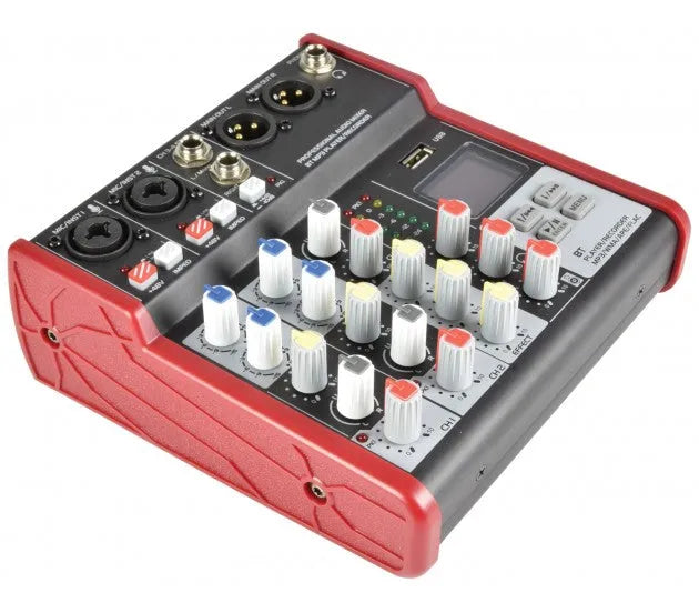 Compact mixing console with 2 or 4 mono and 1 stereo line inputs. Each XLR/jack mono channel with separately switchable microphone/instrument impedance level and switchable +48V Phantom power for studio condenser microphones via XLR connector. Input channels have high/low frequency controls, and mono input channels - the ability to adjust digital echo effects for both vocals and instruments. Internal player/recorder with illuminated display, plays MP3, WMA, APE, FLAC formats from USB media, the ability to connect and play recordings from a mobile device via Bluetooth interface. Output via a pair of XLR balanced connectors with very low noise level, making it perfect for high-quality studio recordings or live concerts.