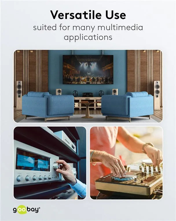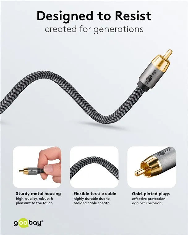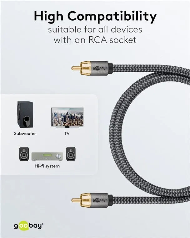 The Goobay Plus series comes in a slim, elegant metal design in Sharkskin Grey. The RCA cable is specially tailored to the analogue low-frequency signals of subwoofers - for a rich, powerful bass response and an impressive music and movie experience.
