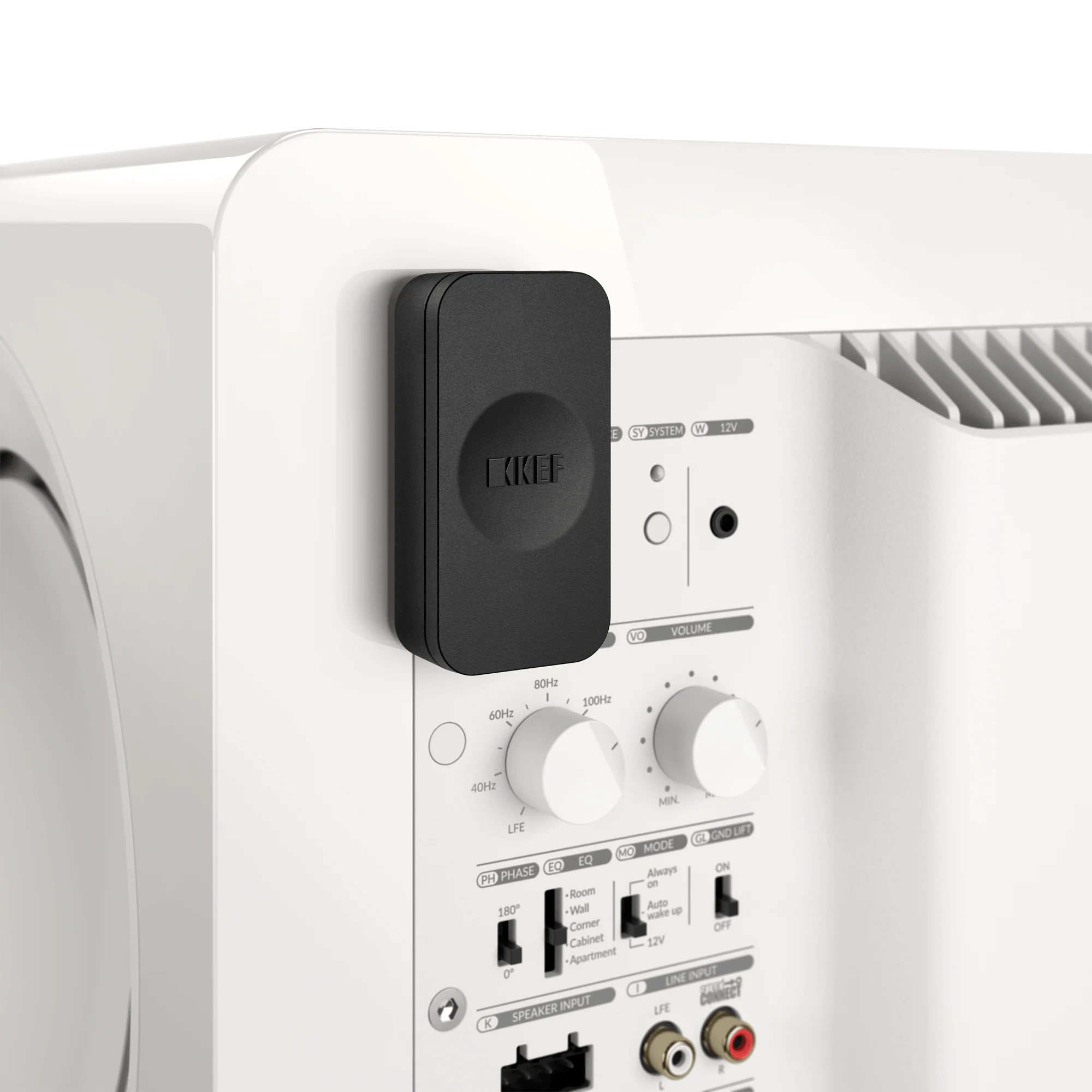 The receiver is also available separately, allowing two KEF subwoofers to receive the same signal wirelessly from the same transmitter.