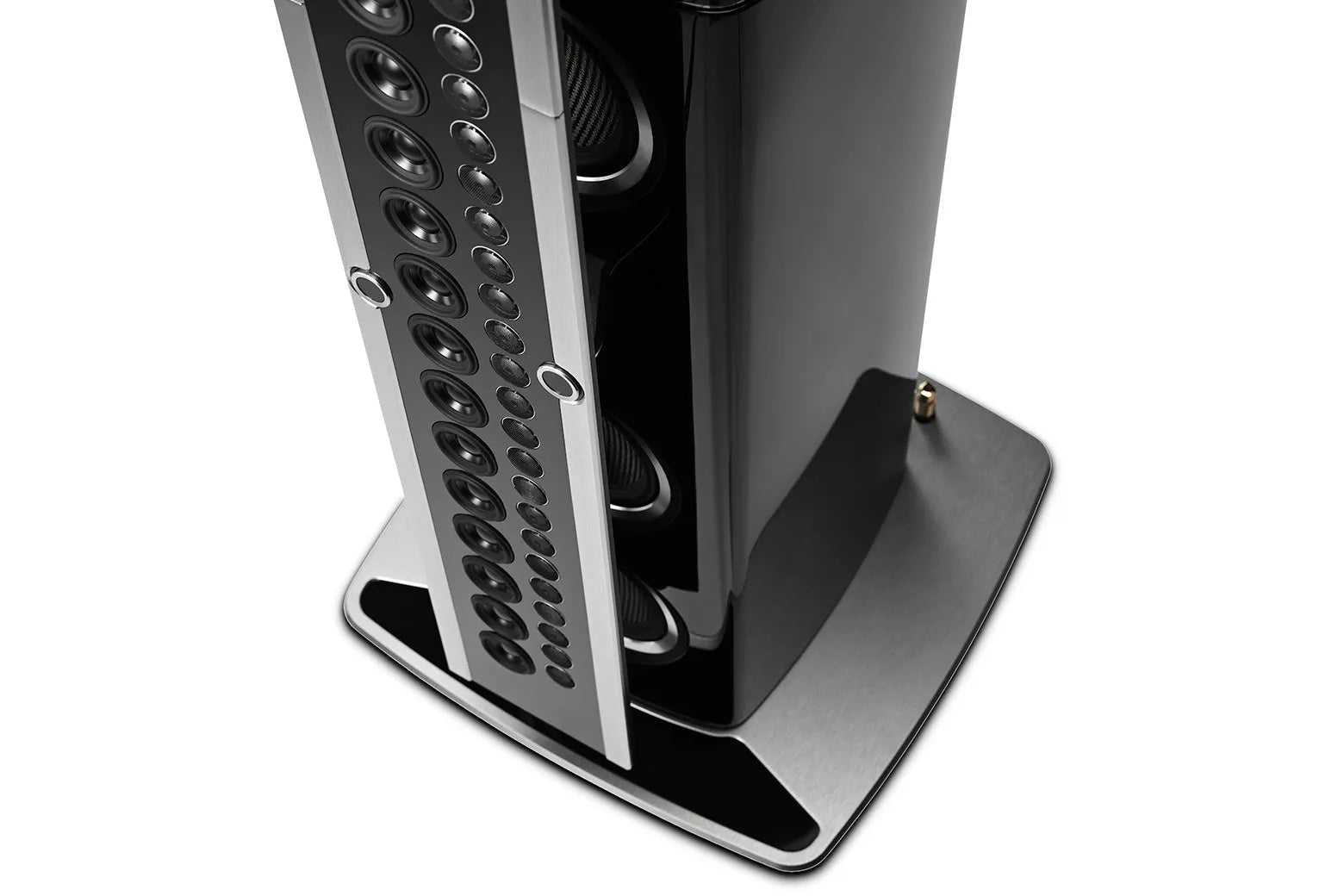 Like the XRT2.1K, the XRT1.1K looks as striking as it sounds. The bass cabinet is finished with 7 layers of high gloss piano black paint and has touches of brushed and black aluminum. The line array features hints of the classic McIntosh front panel with a black center section and silver trim. It is suspended in front of the bass cabinet via steel spiders that are inspired by modern skyscraper construction; they are capped with magnetic covers that mimic the look of McIntosh control knobs. The speaker grilles feature black knit cloth with high gloss trim; if you prefer to have the drivers visible, the grilles are easily removed via their magnetic fasteners. The base plate is made of machined aluminum and glass. It has 4 adjustable feet that allow the speaker to make perfect contact with your floor, thus eliminating a possible source of distortion or vibration.