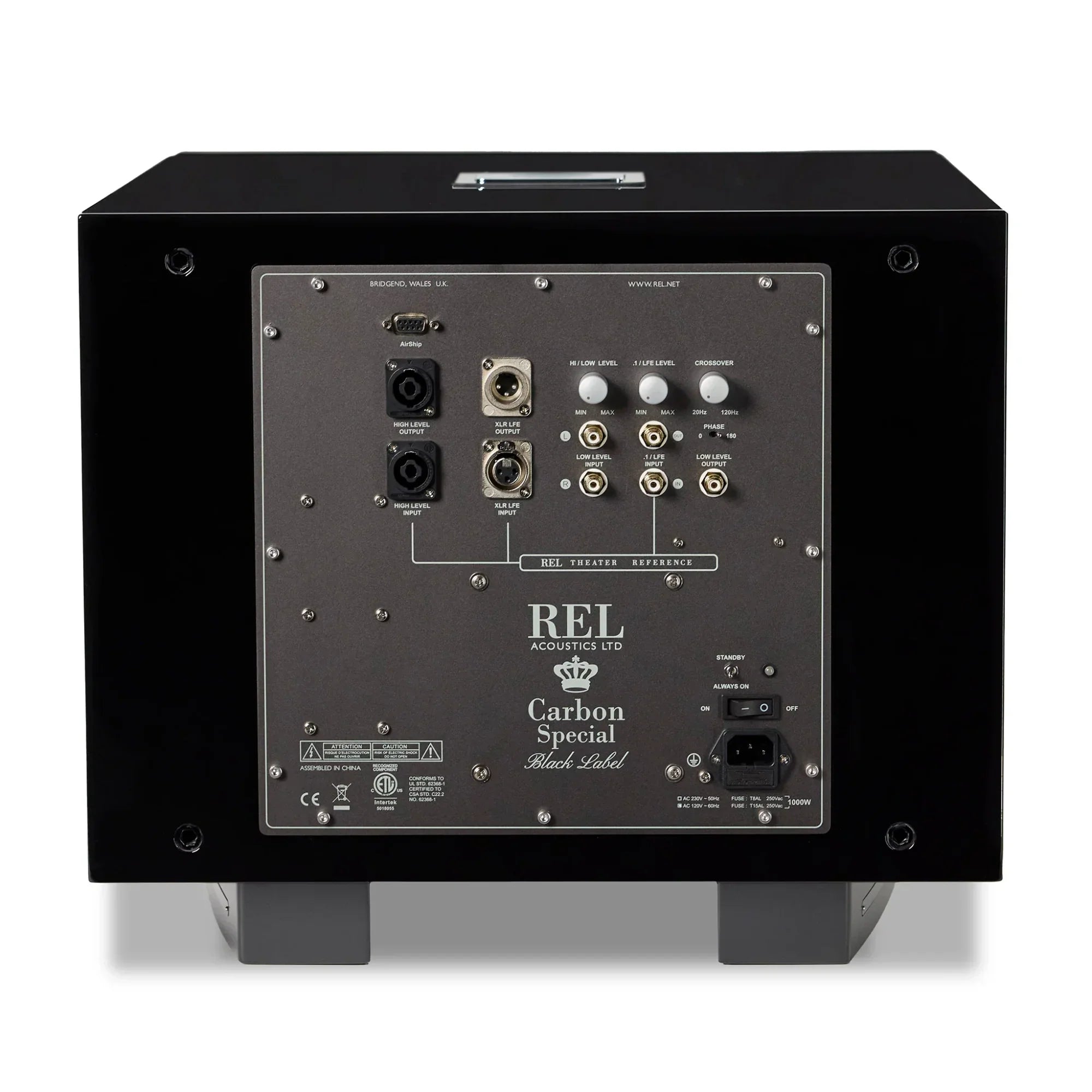 Carbon Special Black Label is powered by a 900-watt hybrid amplifier that combines the rich current delivery of Class A/B monoblocks with the efficiency of a Class D output stage. A 15-pound power transformer and extensive heatsinking form the foundation for high-current performance, adding to the model's weight and commanding authority. This design sustains peaks of 1,250 watts with ease, delivering louder, cleaner, and more controlled bass than any previous medium-chassis REL. The result is an amplifier that unites raw power with the composure and finesse that defines Black Label.