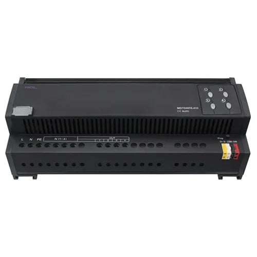 433 is a MOSFET dimmer which supports leading edge and trailing edge dimming. Four selectable dimming curves are available, and the module is able to control inductive, resistive, and capacitive loads. Immediate system changes are possible via on-board manual buttons.