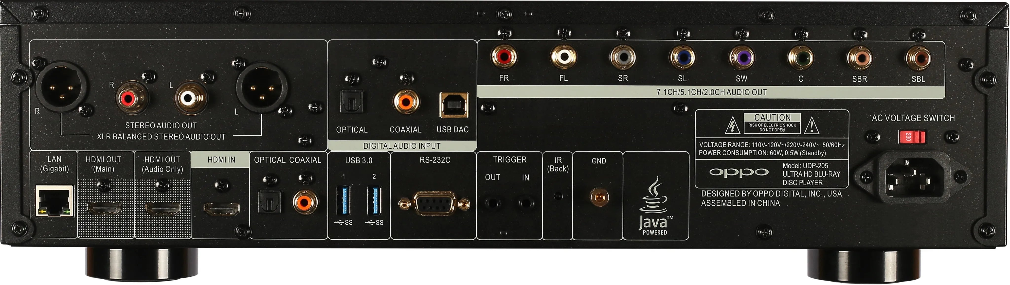 The UDP-205 is easy to integrate into any system due to its ability to receive standard IR, RS-232, IR IN, OPPO produced MediaControl smart device application, third party IP Control system, and HDMI CEC commands. The player also supports Trigger In and Out, so it can automatically turn on and off other devices connected to it for the ultimate convenience.