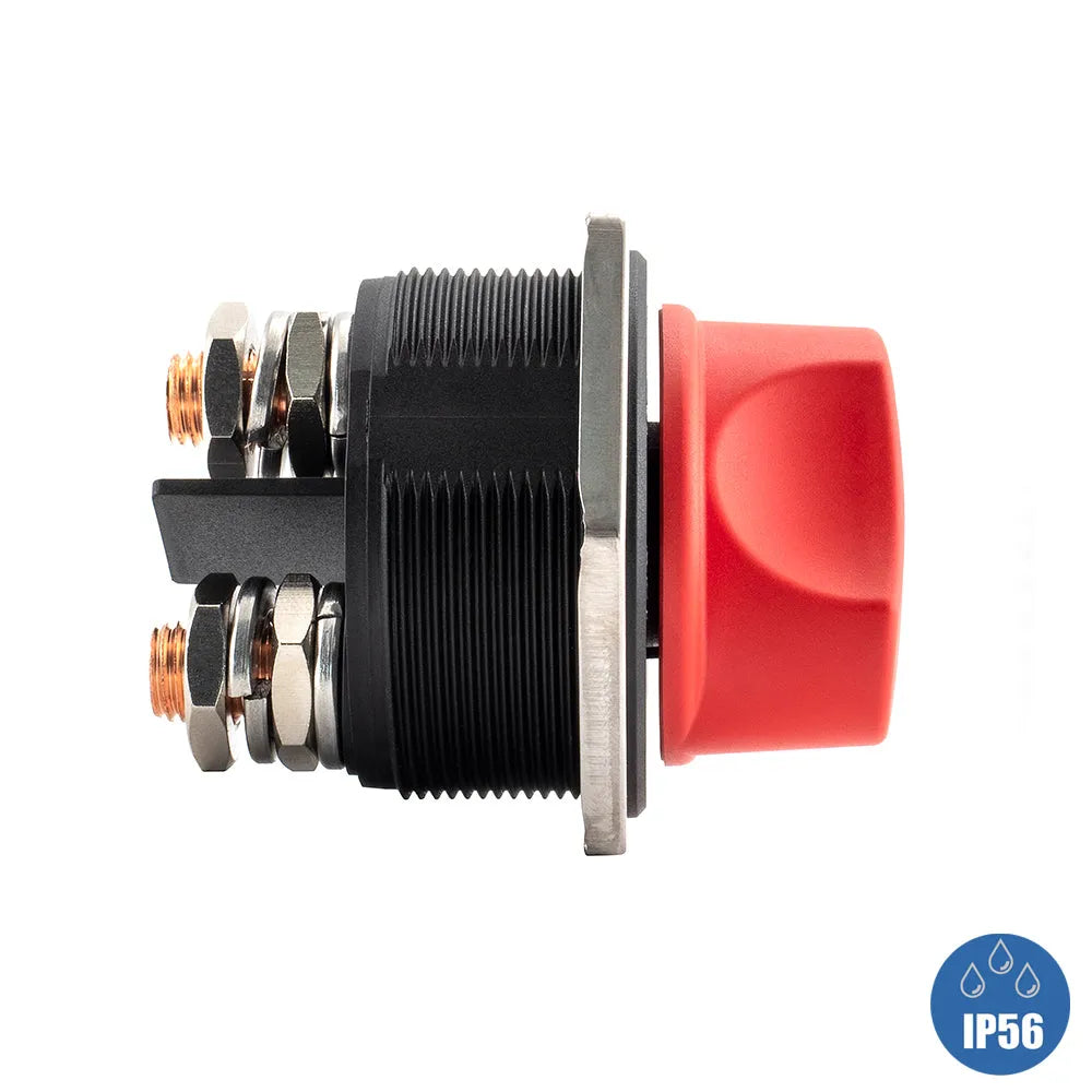 Heavy duty marine battery isolator switch with screw and clamp termination. Rated at 300A 32V DC continuous current, 450A intermittent and 1000A cranking current. Switching positions on and off and the key can be removed at the off position. Waterproof to IP56.