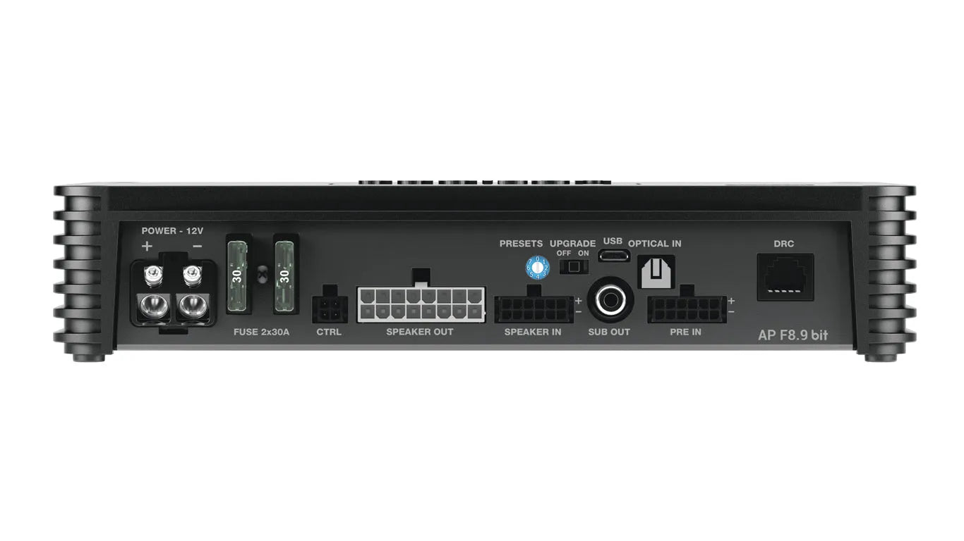 The new AP F8.9 bit-24V version is the ideal for any vehicles with 24 V car electrical system, where high power is required along with the flexibility of the nine-channel DSP. The word “Forza”, meaning “Power” in Italian, well describes the 8 x 85 W RMS and 4 x 260 in bridge mode (RMS @ 4Ω), with an optimal power to size ratio. The integrated processor is equipped with a dedicated software and 7 pre-configured presets for a Plug & Sound experience. Thanks to the built-in Audison USS technology (Universal Speakers Simulator), AP F8.9 bit can also be correctly connected to head-units with “speaker load detection” function that monitors the presence of a low-impedance load to enable the audio outputs.