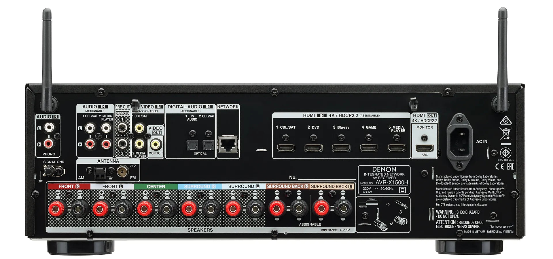 Žiūrėkite savo mėgstamus filmus ir laidas aukščiausia kokybe dėka 4K, Dolby Vision, HDR, HLG ir HDCP 2.2 kurie palaiko visas 6 HDMI įvestis naujajame AVR-X1500H. 7.2 kanalų AV imtuvas - stiprintuvas palaiko 3D audio formatus tokius kaip: Dolby Atmos, DTS:X ir DTS Virtual:X. Transliuokite Spotify, Deezer ir Tidal programomis taip pat dar daugiau galimybių atsiveria naudojant HEOS sistemą. Valdymas tavojo namų kino imtuvo - stiprintuvo dar niekada nebuvo toks lengvas su Amazon Alexa balso valdymu.