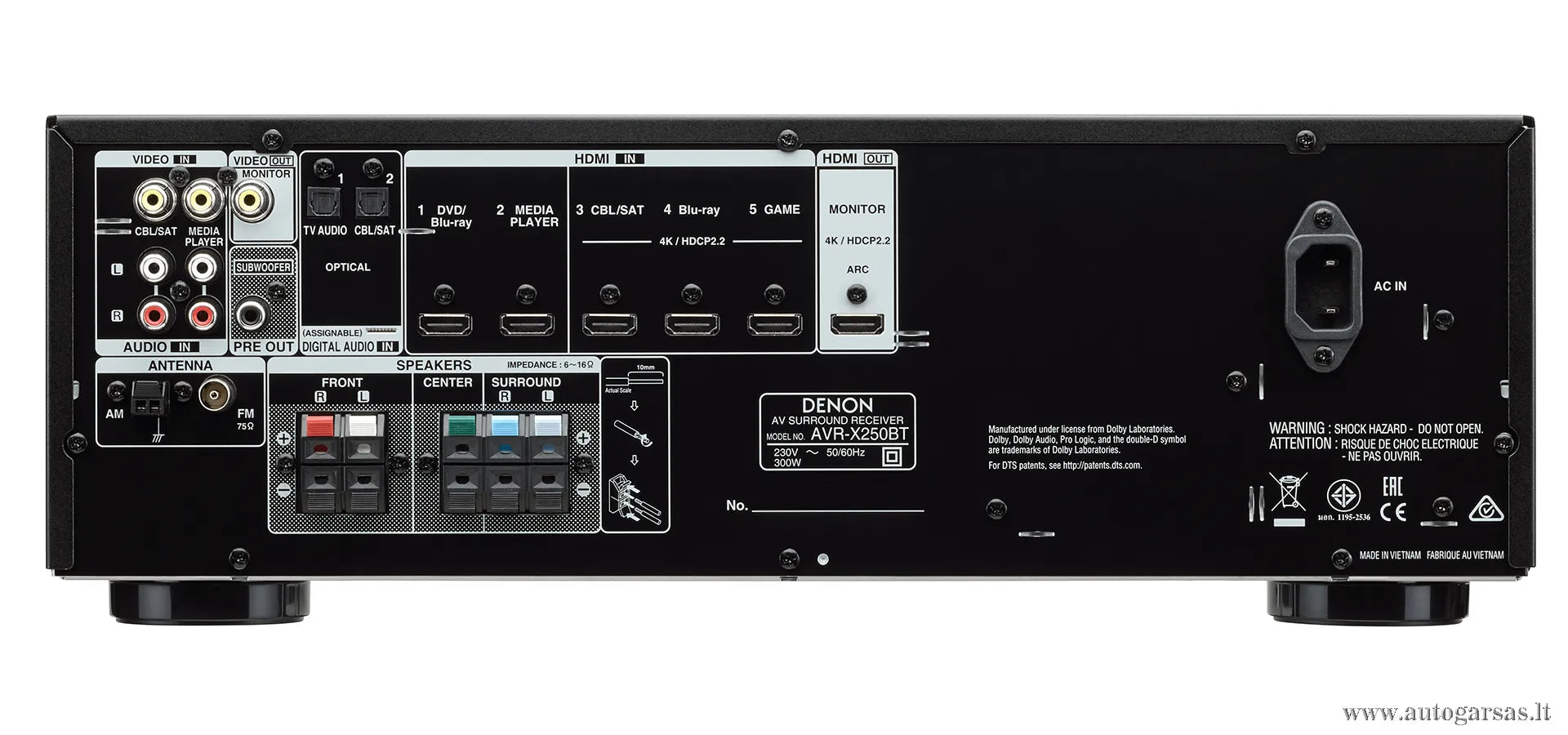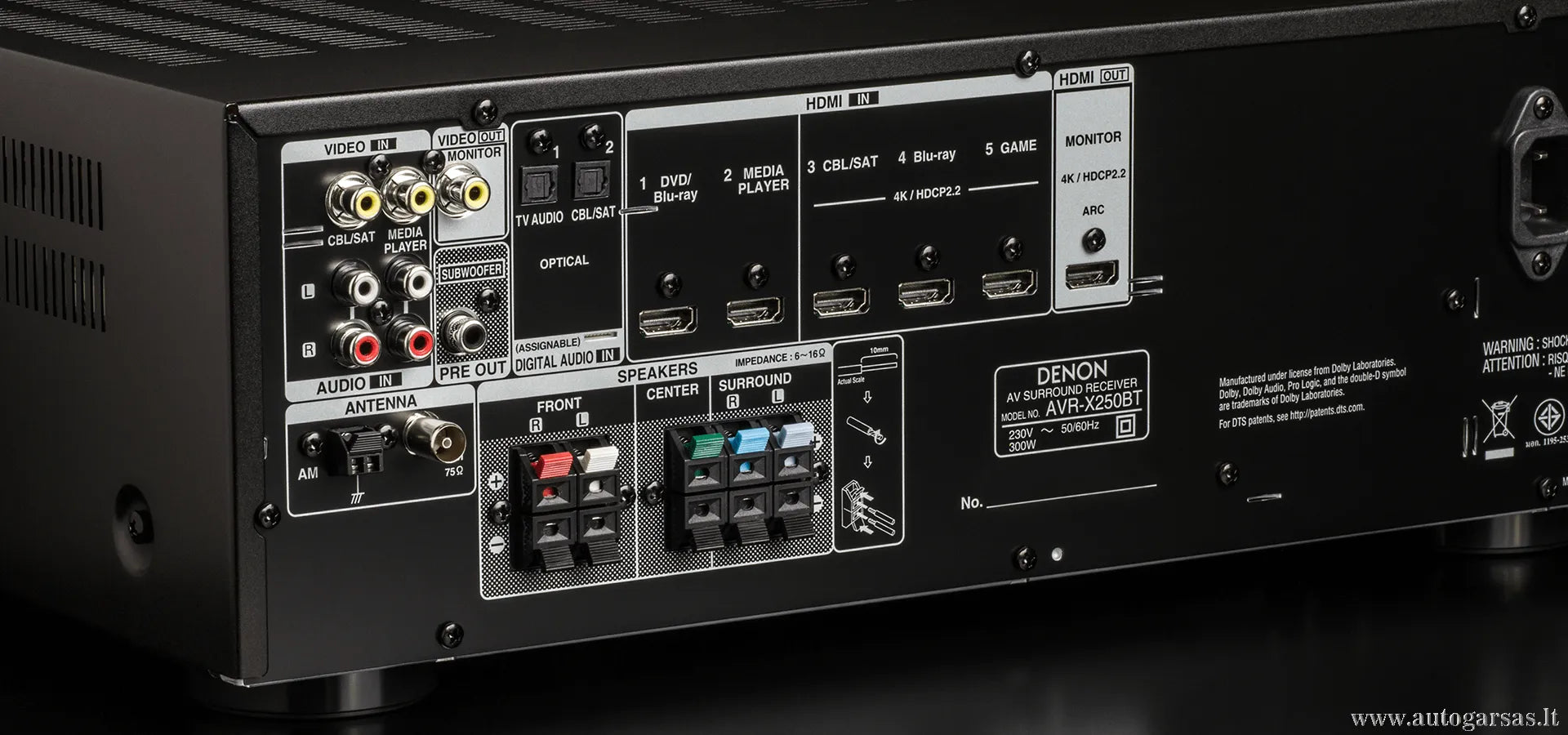 Mėgaukitės mėgstamiausiais filmais ir TV laidomis su 4K Ultra HD vaizdo kokybe, kartu su palaikomais Dolby TrueHD ir DTS-HD garso formatais. Visos penkios HDMI įvestys palaiko naujausią HDCP 2.2 standartą. 5.1 kanalų AVR-X250BT turi integruotą Bluetooth technologiją bevieliam muzikos transliavimui iš bet kurių įrenginių turinčių Bluetooth, ir prisimena iki aštuonių prijungiamų įrenginių. Su patogiu vartotojo vadovu prijungsite šį AV imtuvą - stiptintuvą be vargo. Denon ilgalaikė patirtis užtikriną, kad galėsite mėgautis naujausiomis technologijosmis ir aukščiausios kokybės garsu.