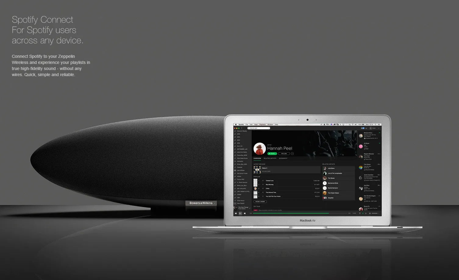 Zeppelin Wireless - belaidė garso kolonėlė. Groja internetinio radijo stotis, WAV, FLAC, WMA, AIFF, AAC, ALAC, MP3 failus iš kompiuteriniame namų tinkle esančių kompiuterių bei per Bluetooth APTx sąsają iš išmaniųjų įrenginių. Apple AirPlay, Spotify ir SoundCloud servisai. Bevielis Wi-Fi ir laidinis Ethernet pajungimas. Analoginis 3.5mm įėjimas išoriniam šaltiniui (TV ar CD grotuvui ir pan.) prijungti. Įmontuoti 4 x 25W ir 1 x 50W stiprintuvai. 2 x 25mm aukštų, 2 x 90mm vidutinių ir 15cm bosinis garsiakalbiai.