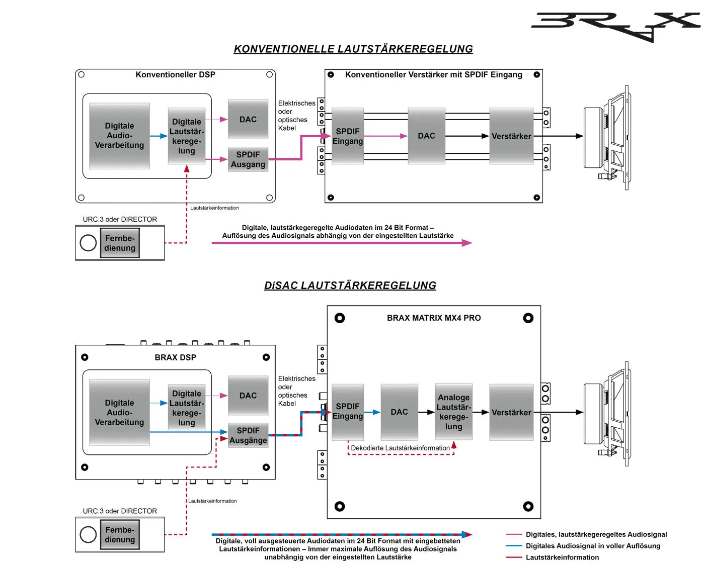 - DiSAC (Digital Signal Analog Controlled) volume control for the digital signal inputs, controllable via BRAX DSP