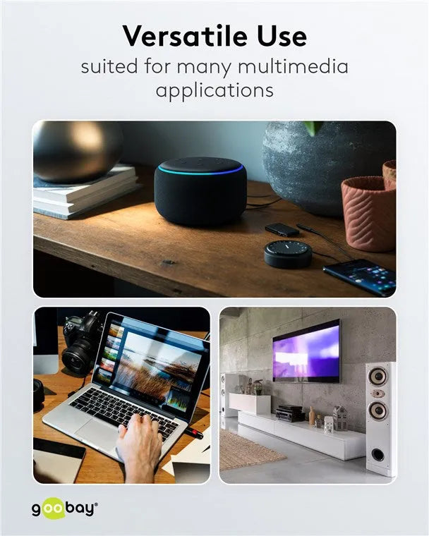 The Goobay Plus series comes in a slim, elegant metal design in Sharkskin Grey. The RCA cable is your simple solution for transmitting crystal-clear sound from smartphones, laptops or home cinema systems - for easily enjoying film and music in superior quality.
