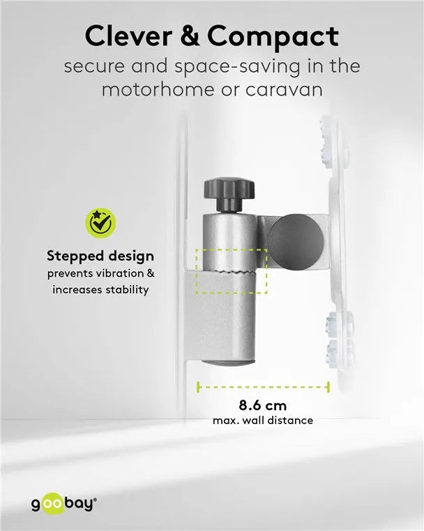 Designed for use in motorhomes or caravans, the wall mount has a locking mechanism and an anti-vibration joint for safe protection while travelling