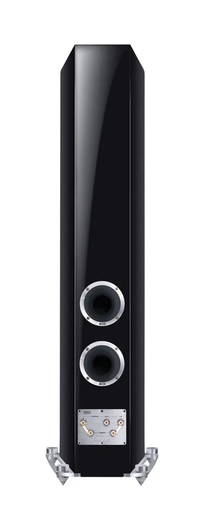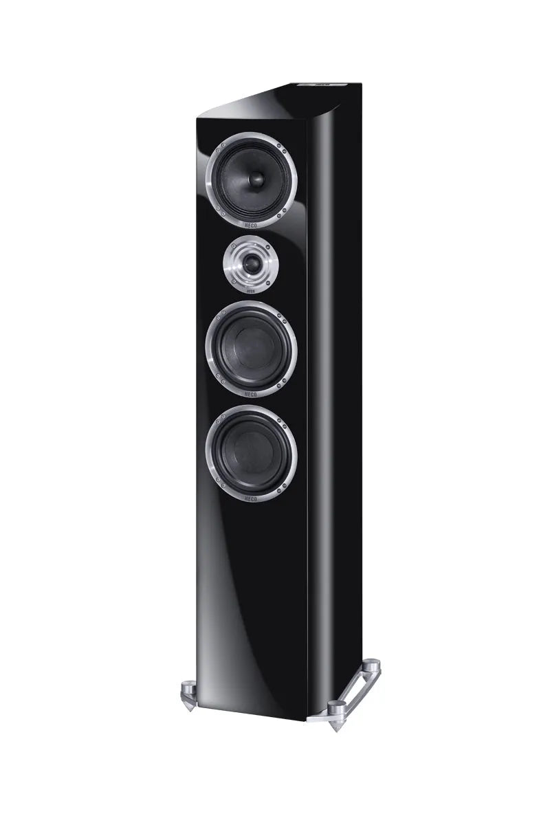 An exquisitely coordinated high-end floorstanding speaker with solid aluminum struts and height-adjustable metal spikes. The optimal weight distribution and acoustic decoupling from the mounting surface ensure an audiophile listening experience of the highest level. All of the frequencies above approx. 2,800 Hz are catered for by the newly developed Fluktus tweeter with its 30 mm PFC dome. The computer-optimized multi-wave front panel of the tweeter ensures perfect dispersion properties, even when it comes to demanding music and film sequences. The bass and mid-range frequencies are catered for by three 170 mm chassis, which accommodate two woofers and a midrange driver. All chassis are equipped with the tried and tested HECO kraft paper cone, which is renowned for its audiophile sound characteristics and high level stability.