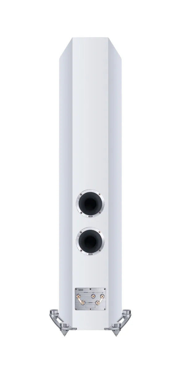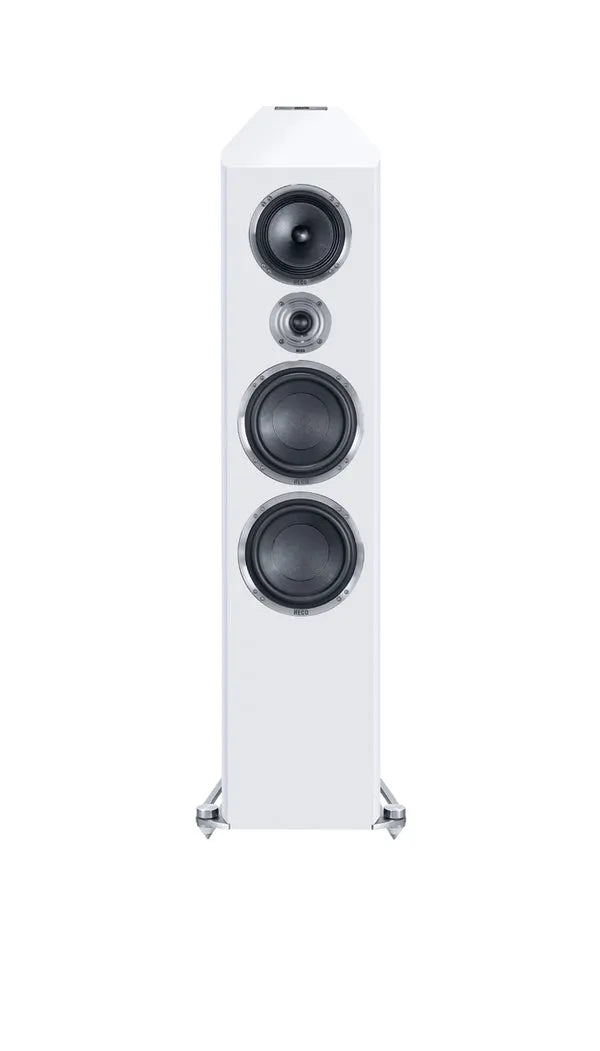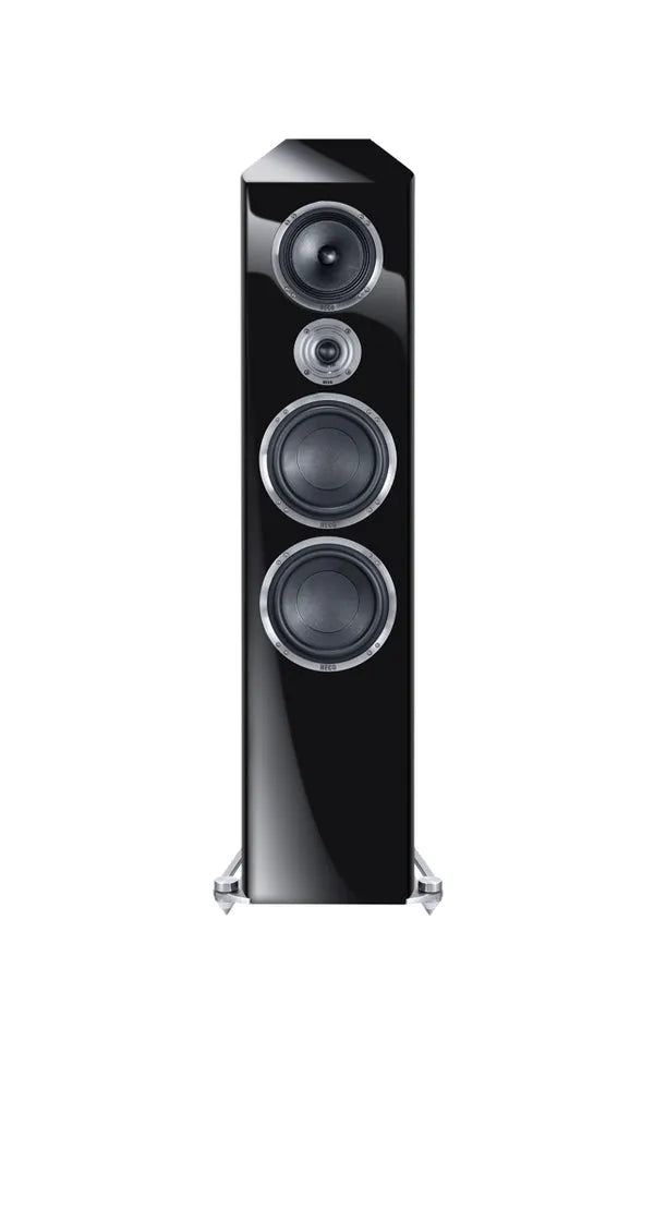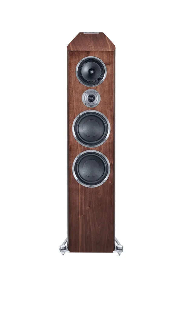 Large state-of-the-art floor standing speaker with outstanding acoustic properties. Eye-catching features of the largest floor standing speaker in the series include its angled top and solid aluminum struts, which provide a broad base for a secure footing. Height-adjustable metal spikes ensure the speaker is positioned at a perfect distance from the ground, thereby paving the way for an unadulterated high-end listening experience. The bass and mid-range frequencies are catered for by two 200 mm woofers and a 170 mm midrange driver with tried and tested HECO Kraft paper cones, which are renowned for their audiophile sound characteristics and high level stability. The newly developed Fluktus tweeter, which features a computer-optimized multi-wave front panel and 30 mm PFC dome, reproduces its entire frequency spectrum with very natural tones and without any form of exaggeration.