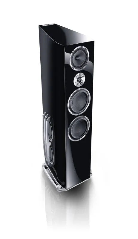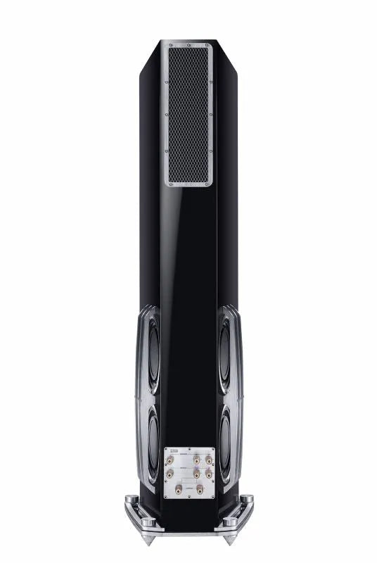 All of this is packaged in a solid enclosure with an acoustically perfect cross-section and workmanship that is second to none. Cool black, in exquisite piano lacquer of course, contrasts with solid aluminum elements, which set standards not only visually, but also in terms of construction.