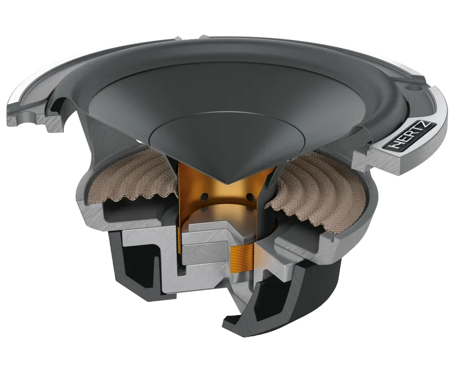 3. Exponential V-cone® profile pressed-pulp cone with cotton fibers, combining stiffness and lightweight for a wide frequency response. Cone profile geometrically optimized for utmost linearity and dispersion in the mid-high frequency range.