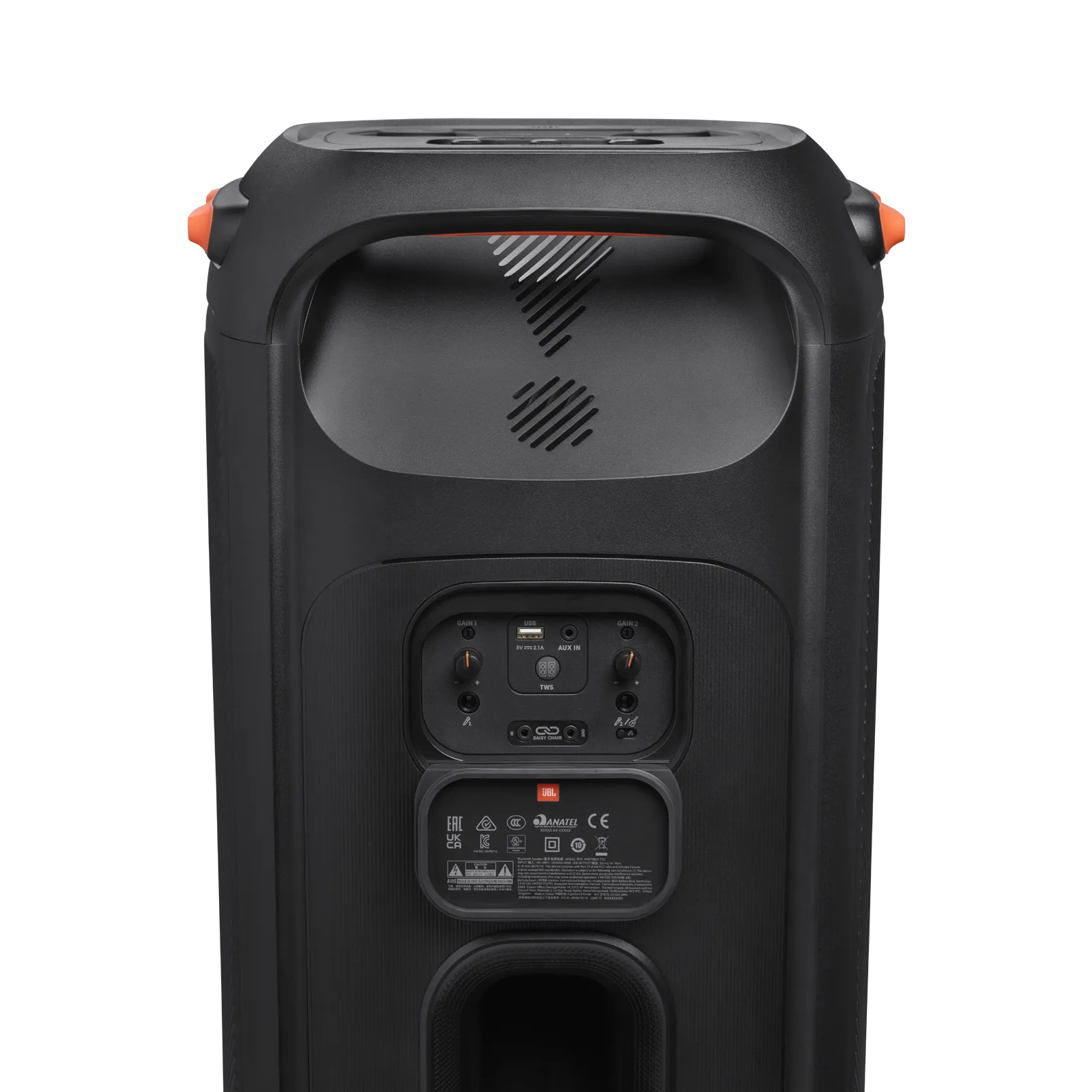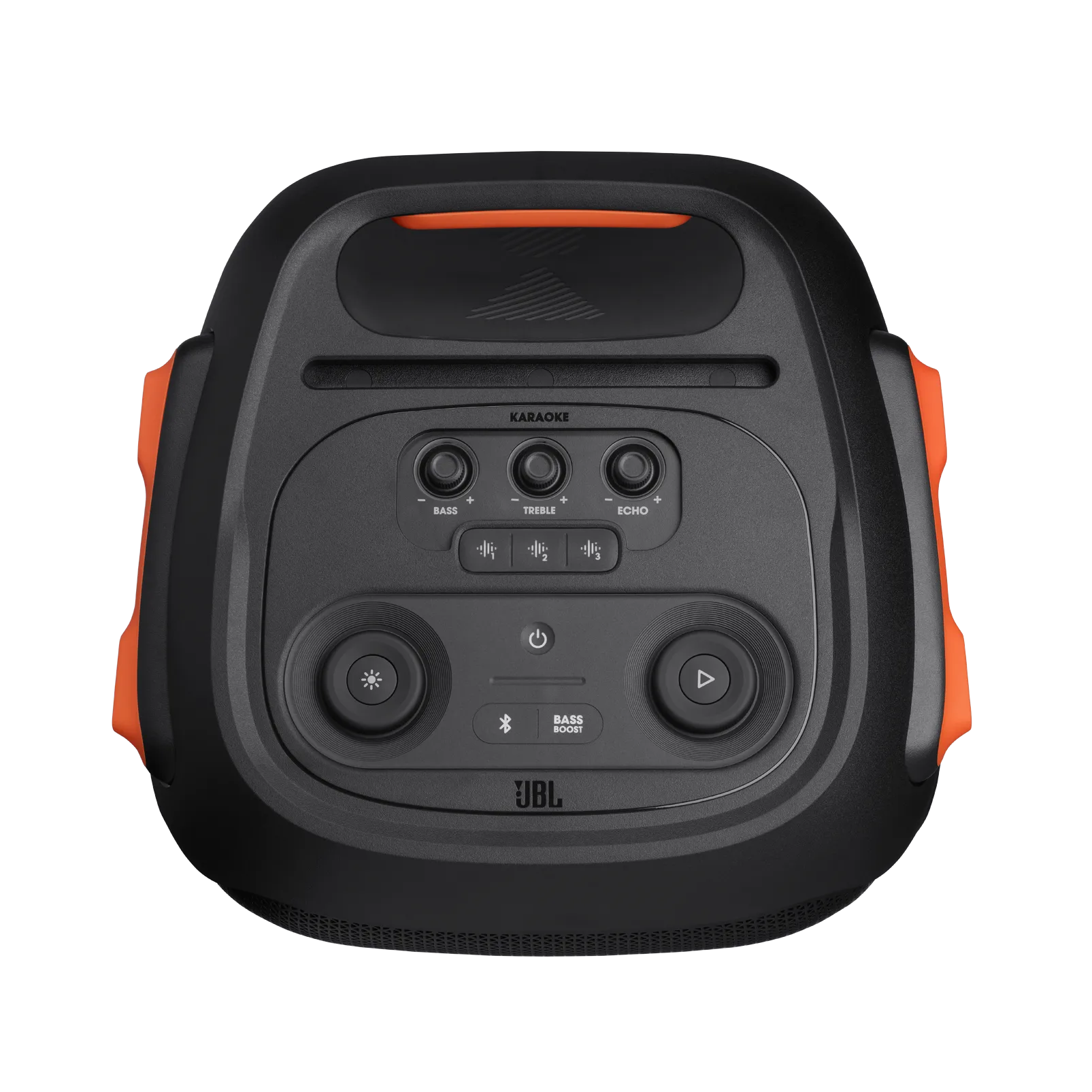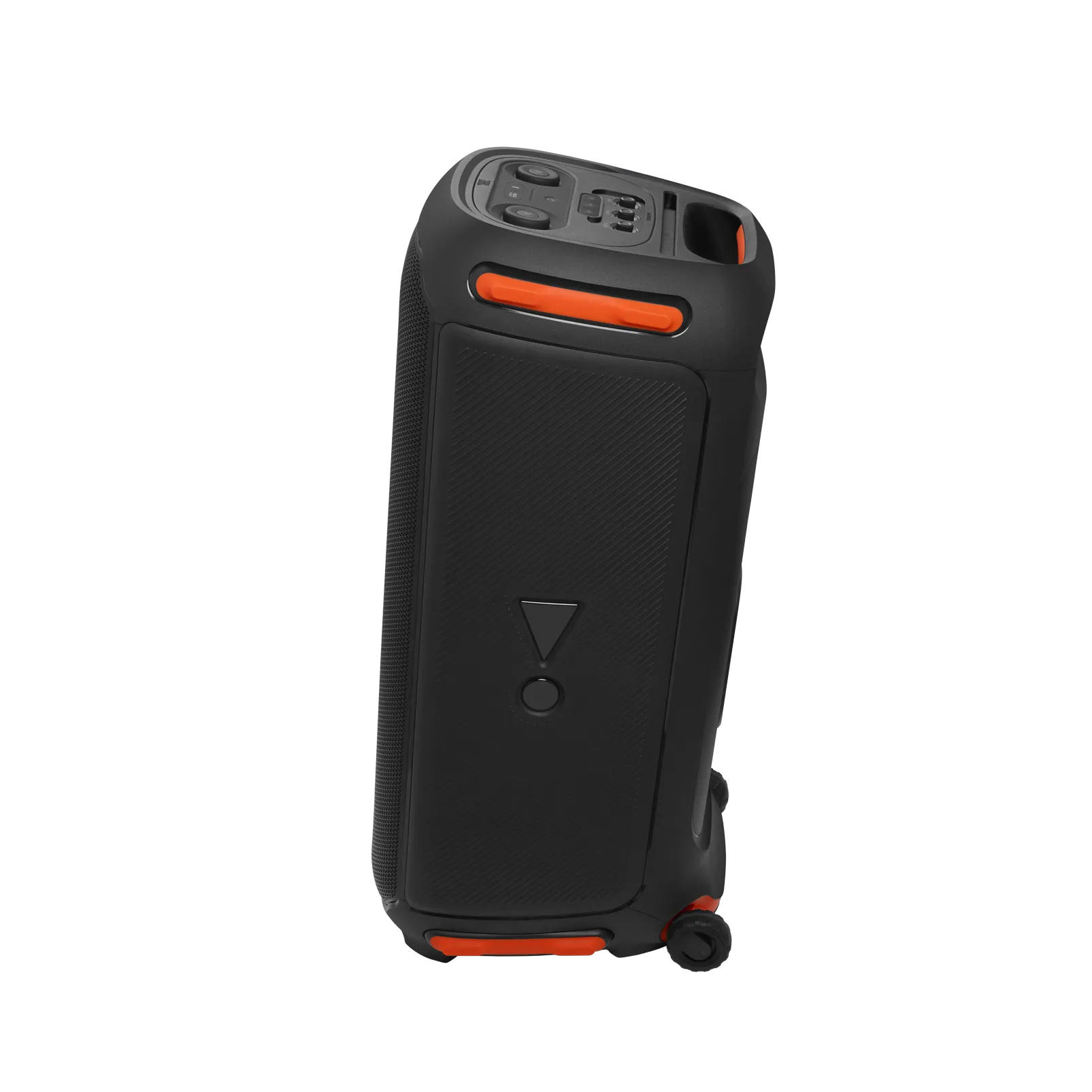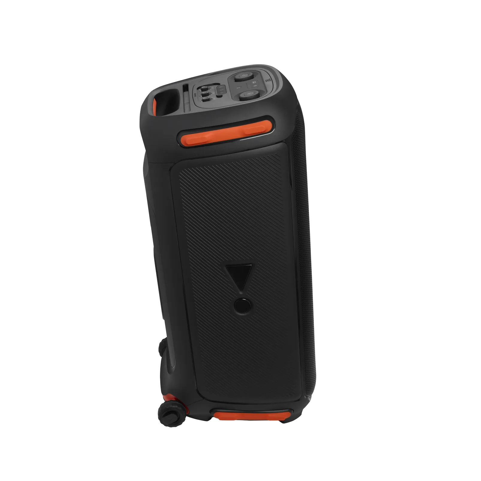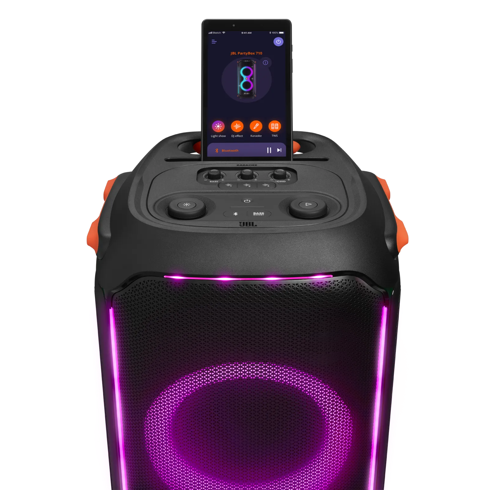 The splashproof PartyBox 710 transforms your next event into a real party, concert or nightclub. With its unique and colorful light show synced to JBL Original Pro Sound. Minimalistic and intuitive top panel controls and the PartyBox App let you create next-level musical and visual experiences. Customizing both the flashing, strobe lights and the amazing sound from the dual set of tweeters and bass-rich woofers. One-button True Wireless Sound instantly pairs two PartyBox 710s for an even bigger crowd. And with an easy-to-grip handle and robust wheels, you can keep the good times rolling wherever the party goes.