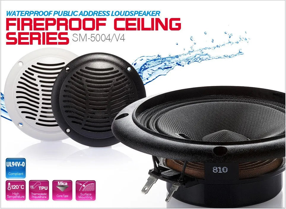 SM-5004/V04 is especially suited for out-door sound reinforcement systems, car audio system and any other type of audio system in areas with high temperature. Applications include steam room, sauna, gas station, kitchen, restaurant, food preparation area, chemical laboratories and other similar environments. Completely fireproof, waterproof, resistant to UV radiation, acid, alkali, chlorine and other chemicals are exactly the qualities needed for operating in difficult and challenging environments.