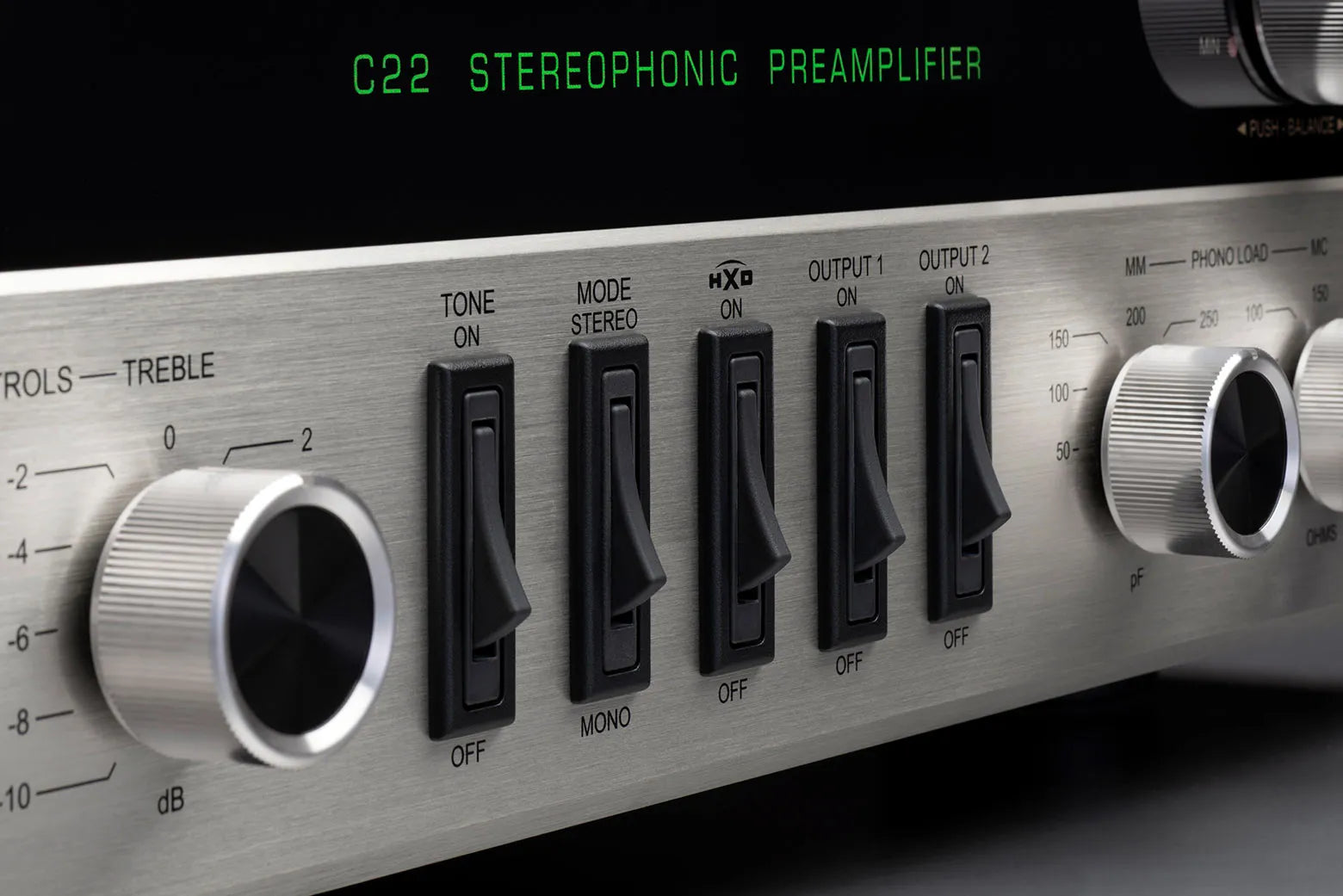The C22 Mk V uses one 12AT7 and five 12AX7A vacuum tubes which can be seen through a glass panel located on the top of the preamp. Knobs and rocker switches operate all control functions while modern LED lights indicate input selection and volume level. The C22 Mk V has two balanced inputs, three unbalanced inputs, one Moving Coil and one Moving Magnet phono inputs, for a total of seven inputs. There are two pairs each of balanced and unbalanced output connections; the two outputs allow sending signals to two separate power amplifiers.