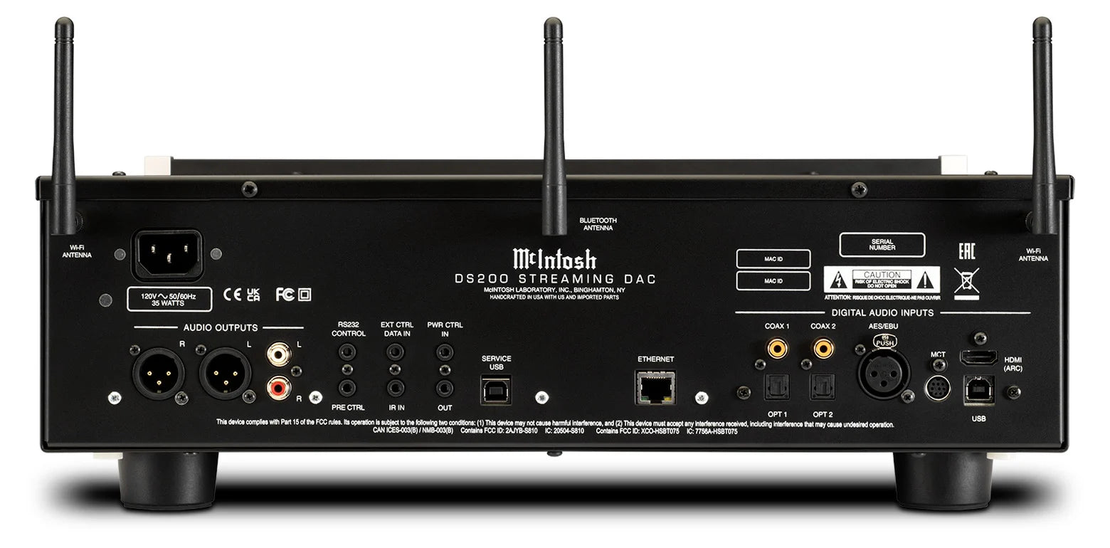 The DS200 Streaming DAC is designed with timeless McIntosh aesthetics and high-quality materials, such as a black glass front faceplate, rotary control knobs, illuminated logo, and custom machined aluminum end caps. A Data IN port along with Power Control ports allow for seamless integration with other McIntosh components, while the RS232 Control port can be used in more advanced installations. A remote control is included.
