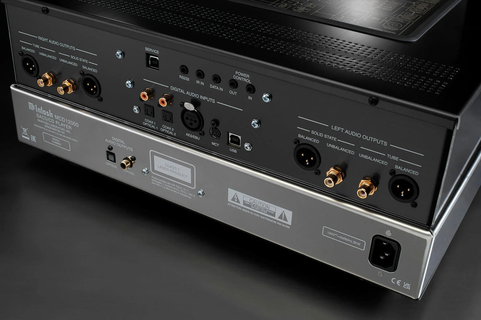 All outputs are driven by discrete amplifiers or a blend of vacuum tubes and discrete amplifiers. For vacuum tube output, one 12AT7 tube and one 12AX7A tube are assigned to each the left and right audio channel. Solid state output is via a discrete balanced op-amp. A digital coax and optical output are included for added flexibility to connect the MCD12000 to the rest of your home audio system.