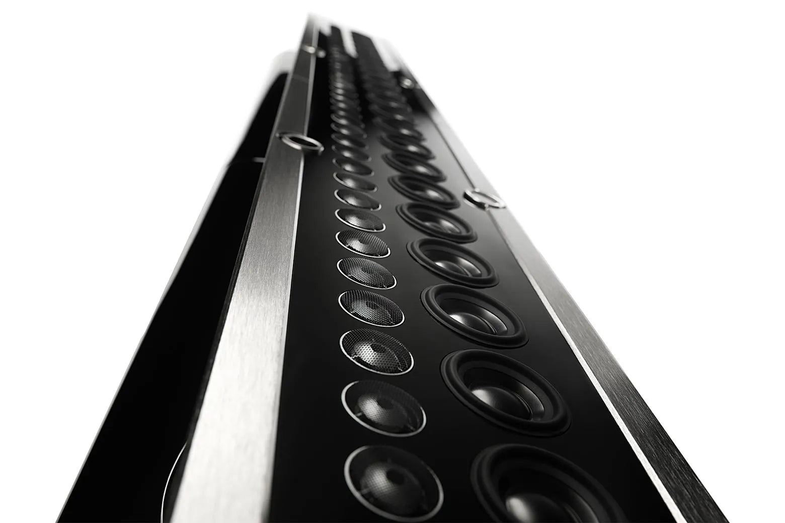The XRT1.1K uses a total of 70 individual drivers consisting of (4) 6.5” woofers, (2) 6.5” low frequency midranges, (24) 2” upper frequency midranges and (40) ¾” tweeters. The woofer and low frequency midrange drivers that were first designed for the XRT2.1K have been incorporated into the XRT1.1K.