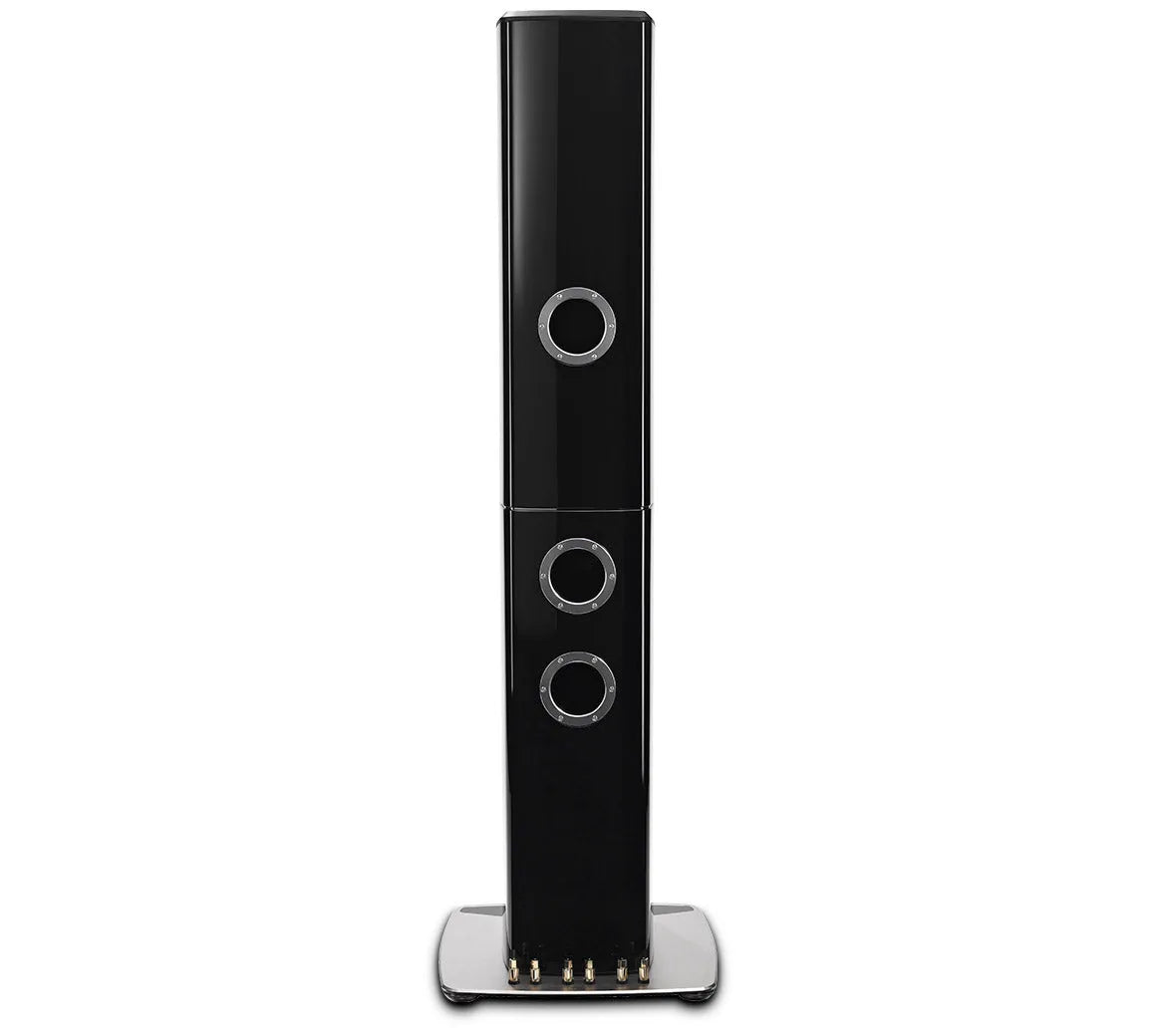 Like the XRT2.1K, the XRT1.1K looks as striking as it sounds. The bass cabinet is finished with 7 layers of high gloss piano black paint and has touches of brushed and black aluminum. The line array features hints of the classic McIntosh front panel with a black center section and silver trim. It is suspended in front of the bass cabinet via steel spiders that are inspired by modern skyscraper construction; they are capped with magnetic covers that mimic the look of McIntosh control knobs. The speaker grilles feature black knit cloth with high gloss trim; if you prefer to have the drivers visible, the grilles are easily removed via their magnetic fasteners. The base plate is made of machined aluminum and glass. It has 4 adjustable feet that allow the speaker to make perfect contact with your floor, thus eliminating a possible source of distortion or vibration.