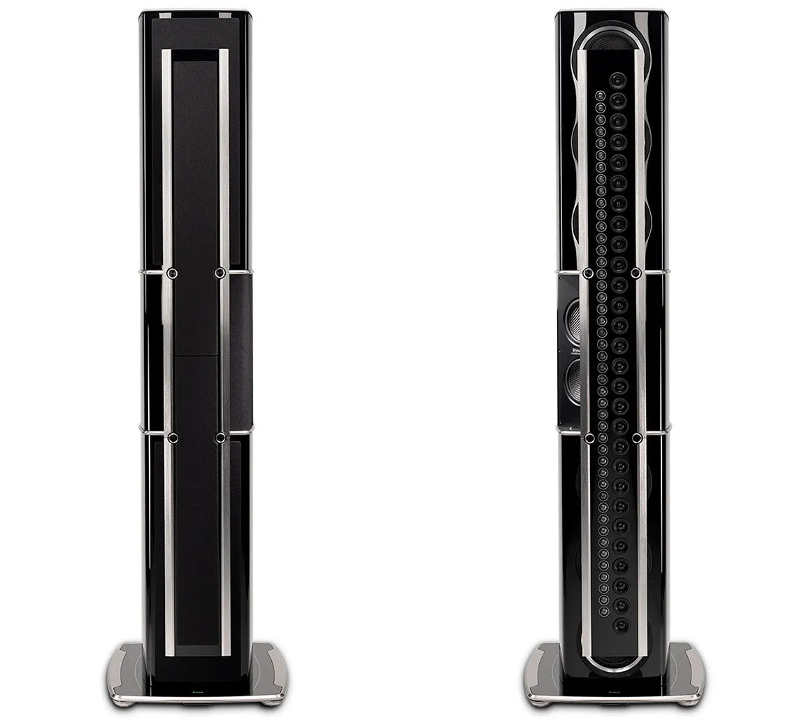 Visually, the XRT2.1K is as striking as it sounds. The reinforced bass cabinet is a combination of brushed and black aluminum and is finished with 7 layers of high gloss piano black paint. The line array mimics the timeless McIntosh front panel appearance with a glossy black center section and 2 silver aluminum end caps. It is suspended from the front of the bass cabinet via steel spiders that are capped with magnetically attached covers that look like a McIntosh control knob. The removable speaker grilles are attached via magnets and feature black knit cloth with high gloss trim. The cabinet pedestal is made of machined aluminum and glass; it is supported by 4 adjustable feet that allow the speaker to make perfect contact with your floor, thus eliminating a possible source of distortion or vibration.