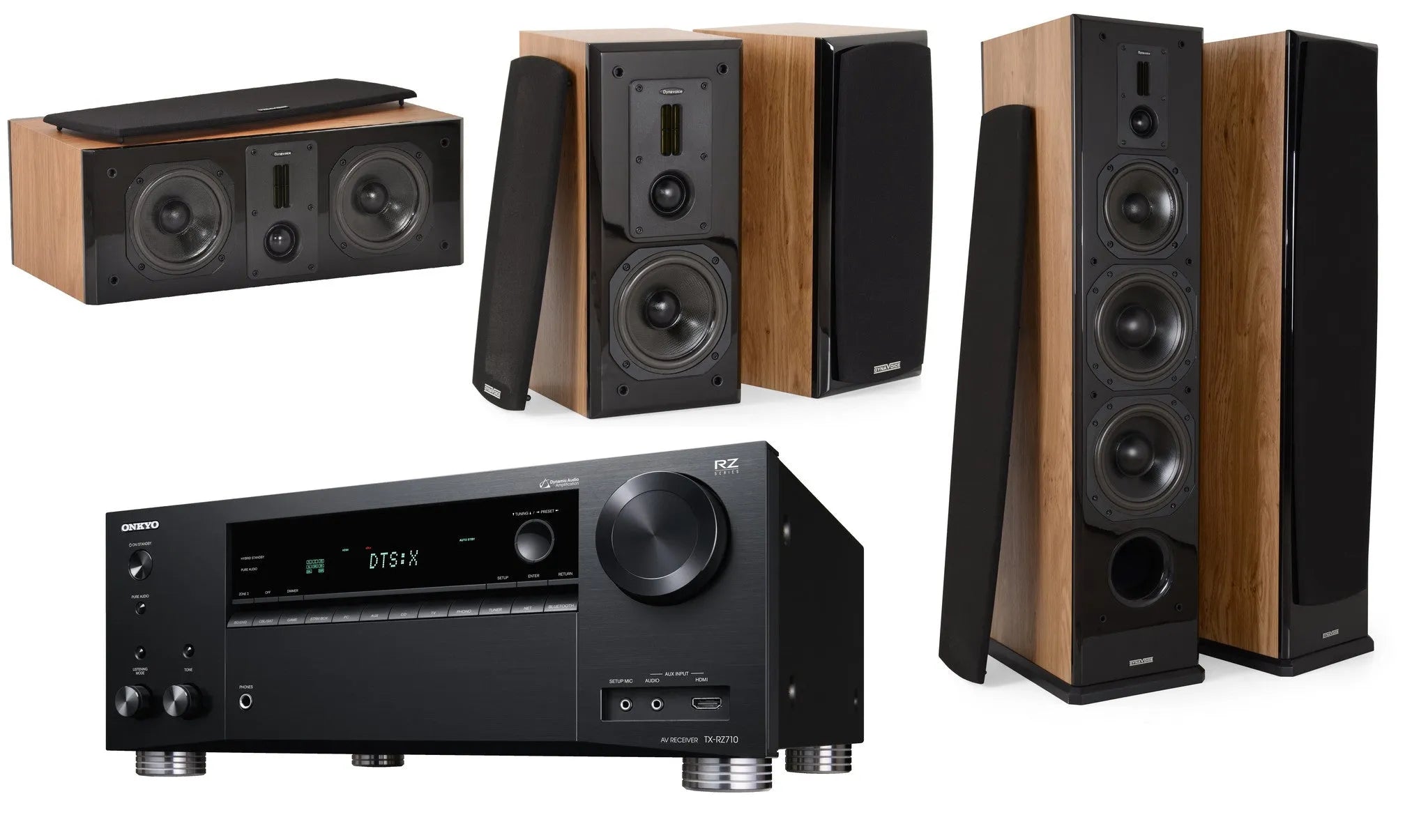 Gero garso namų kino komplektas su stiprintuvu Onkyo TX-RZ710, bei kolonėlėmis Dynavoice Definition DF-8 (2 vnt), DC-5 (1 vnt), DX-5 (2 vnt). Galimybė pačiam sukombinuoti kolonėlių, bei stiprintuvo spalvas pagal poreikį.