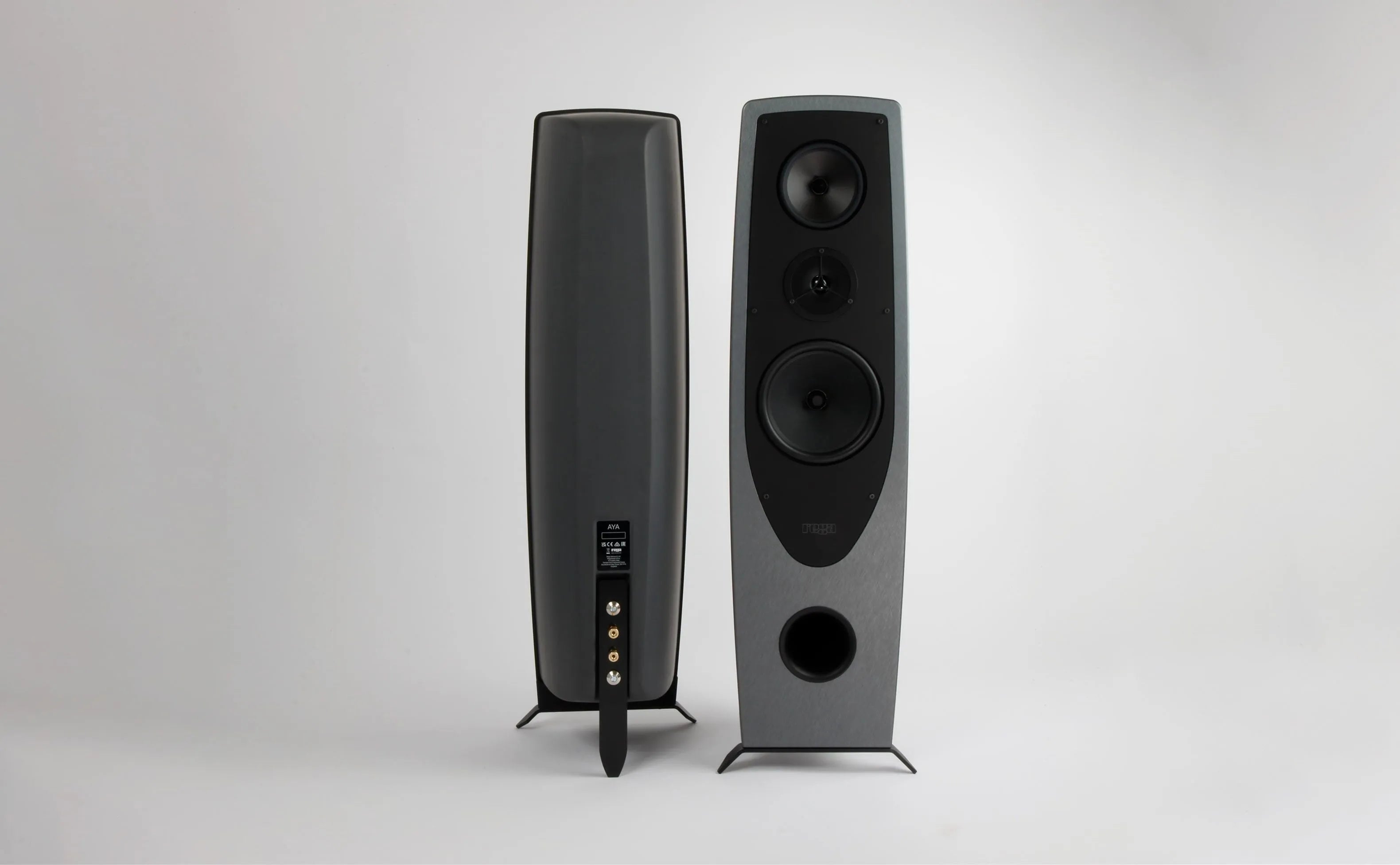 Rega AYA - netradicinės, 2.5 juostų, skulptūriško industrinio dizaino garso kolonėlės, kurių korpusai pagaminti iš lengvo, bet labai tvirto, modernaus GRC kompozito - stiklo pluošto audinio sustiprinto cementu.