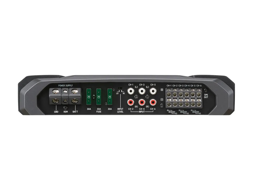 6-канальные RCA-входы для подключения акустических систем принимают сигналы низкой и высокой мощности. Это позволяет легко подключить R-A90S напрямую к штатной автомобильной магнитоле, независимо от выходной мощности вашего головного устройства. Клемма для силового кабеля принимает кабели большого сечения до 4 AWG.