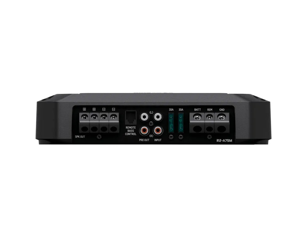 В конструкции R2-A75M продуманы до мелочей удобство и простота. Все разъемы для подключения акустических систем расположены на одной стороне устройства для легкого доступа, а элементы управления усилителем перенесены на верхнюю панель под съемную пластину, что позволяет быстро регулировать усиление и частоту кроссовера. Корпус усилителя также включает в себя встроенные монтажные «ножки» для упрощения процесса установки.