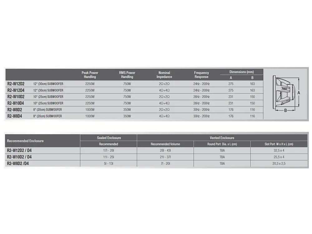 Новые сабвуферы серии R доступны в конфигурациях 12", 10" и 8" и выпускаются с двойным сопротивлением 2 Ом и двойным сопротивлением 4 Ом.