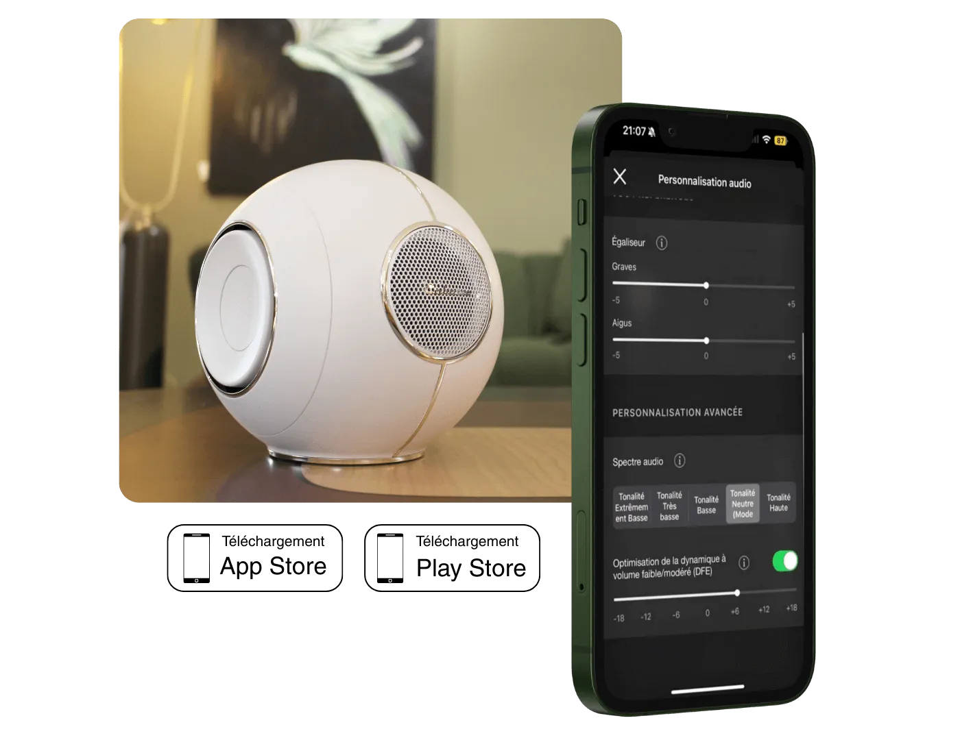 Внутри динамика - 3 усилителя: 1000 Вт для низких частот и 2 x 300 Вт для средних и высоких частот. Максимальная общая мощность усилителей - 3200 Вт. Динамики: коаксиальные с высокими 1,9 см и 13 см среднечастотными диафрагмами и 25 см сверхдлинноходными басами. Воспроизводимый диапазон частот 14 - 27 000 Гц. Благодаря сочетанию высокочувствительных динамиков и мощных усилителей пара этих динамиков может создавать максимальное звуковое давление 124 дБ. Сервисы Tidal, Spotify, Deezer. Интернет-радио. Возможность воспроизведения музыкальных файлов с разрешением до 24 бит/192 кГц со смарт-устройств (телефонов, планшетов), а также компьютеров и серверов, объединенных в компьютерную сеть. Беспроводное соединение Bluetooth. Беспроводное соединение Bluetooth. Цифровые оптические и аналоговые RCA-входы для подключения внешних устройств (телевизор, CD-плеер, виниловый проигрыватель и т. д.). USB-порт для воспроизведения с внешних носителей. Подключается к компьютерной сети через Wi-Fi или Ethernet. Система акустики помещения. Управление осуществляется через приложение для смарт-устройств и прилагаемый пульт дистанционного управления. Размеры (В x Ш x Г): 33 x 33 x 32 см. Вес: 18 кг. The Pearl предлагается в трёх вариантах: для установки на мебель, для подвешивания на стену с помощью настенного кронштейна и для установки на пол с помощью подставки. Отделка: глянцевый чёрный, глянцевый белый.