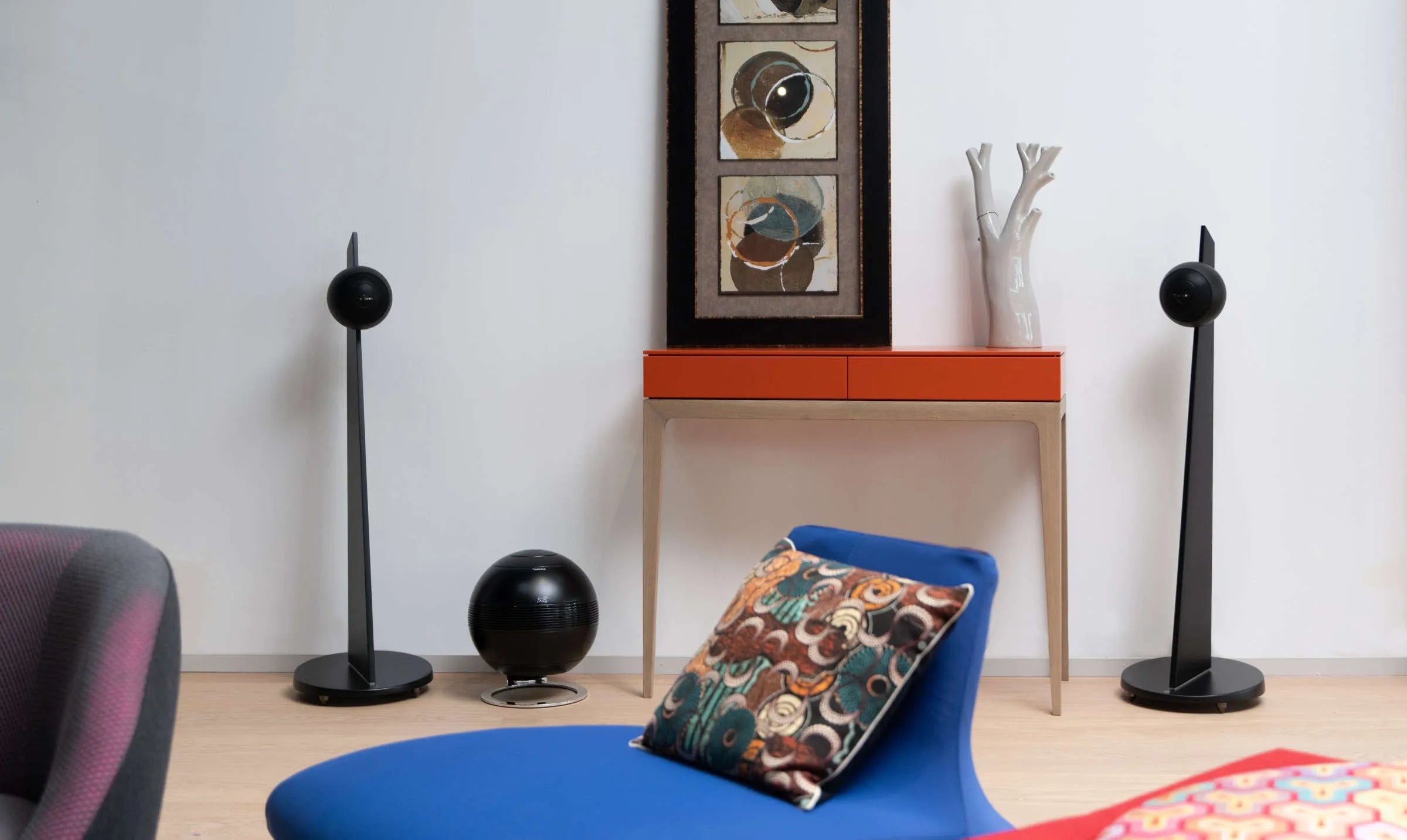 Сабвуфер PEARL имеет изысканную подвесную конструкцию и установлен на грубо обработанном, изогнутом и хромированном стальном основании, которое удерживает сабвуфер в воздухе. Четыре последовательных слоя матовой краски обеспечивают идеальную сферическую визуализацию.