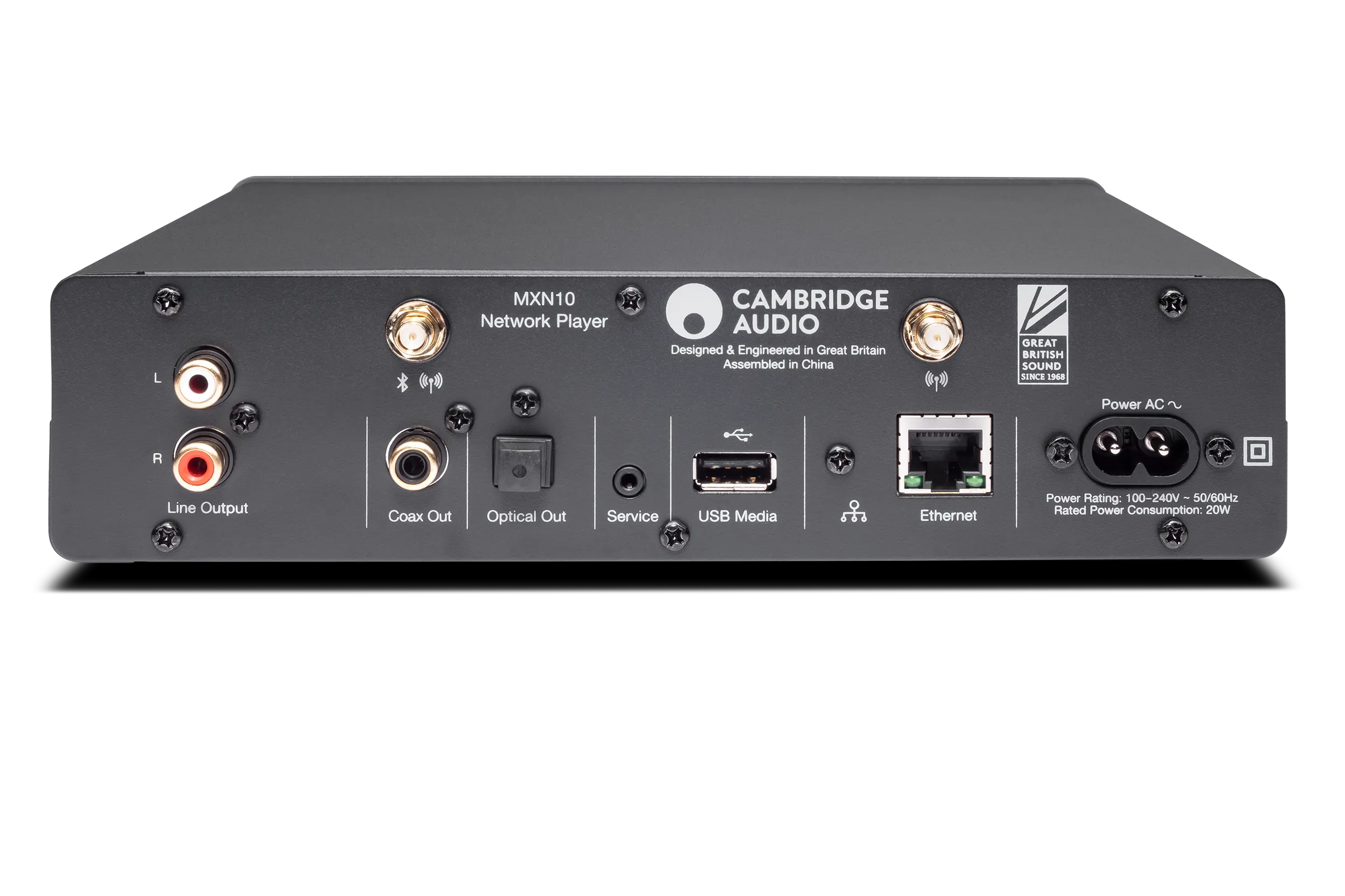 Разверните MXN10, и вы увидите пару аналоговых выходов RCA phono, цифровой коаксиальный и оптический выходы, вход USB, пару разъемов для антенн Wi-Fi для подключения к беспроводной сети или вход для кабеля LAN, если вам так удобнее.