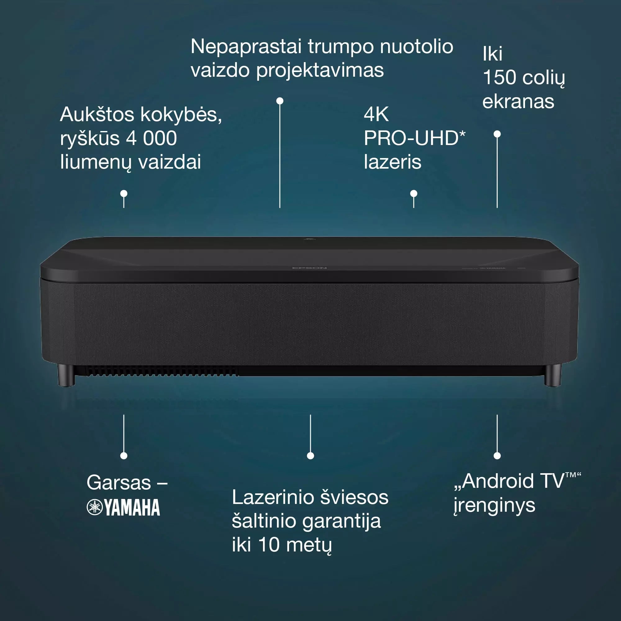 Улучшение 4K, Android TV, автоматическое включение, автоматический поиск источника, встроенный динамик, Chromecast, цифровой зум, интерполяция, длительный срок службы источника света, Quick Corner, звук от Yamaha