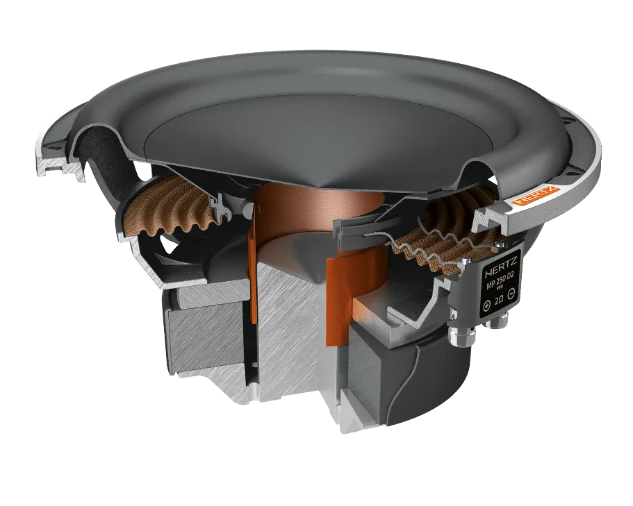 Выдающиеся характеристики при компактном размере – это цель автомобильных сабвуферов Mille Pro. Благодаря своим Используя ноу-хау, приобретенные в Mille Legend , команда НИОКР оптимизировала производственный процесс, чтобы предложить «Hertz Sound Experience» более широкой аудитории, используя часть технологий и материалов флагманской линейки. МП 250 Д2.3 Конус изготовлен методом прессования бумажной массы с добавлением минеральных порошков. Такая же технология изготовления используется для Legend. V-cone® Профиль увеличивает жёсткость, позволяя конусу работать как поршень. Материалы окружающего материала изготовлены из высокочистого материала. Изготовлены из бутилкаучука IIR . Как и модели Legend ML2000.3 и ML2500.3, сабвуферы Mille PRO изготовлены с использованием технологии Boundary Free Surround, которая обеспечивает большую площадь звучания при одинаковом диаметре и более высокое звуковое давление. Компактный 6-спицевый алюминиевый сплав антирезонансный Корзина такая же, как у топовой модели ML 2500.3, и способствует механическому демпфированию сабвуфера, будучи абсолютно прозрачной для звука. 65-мм 4-слойная звуковая катушка выше 60 мм и намотан на формовщик TIL-P, что обеспечивает высокое линейное перемещение. Конфигурация импеданса DVC 2 Ом + 2 Ом повышает универсальность и позволяет согласовать усилители с любой системой. Система воздушного охлаждения и декомпрессии устраняет необходимость в центральном отверстии в нижней пластине, что даёт три преимущества: