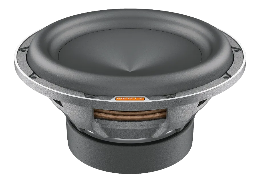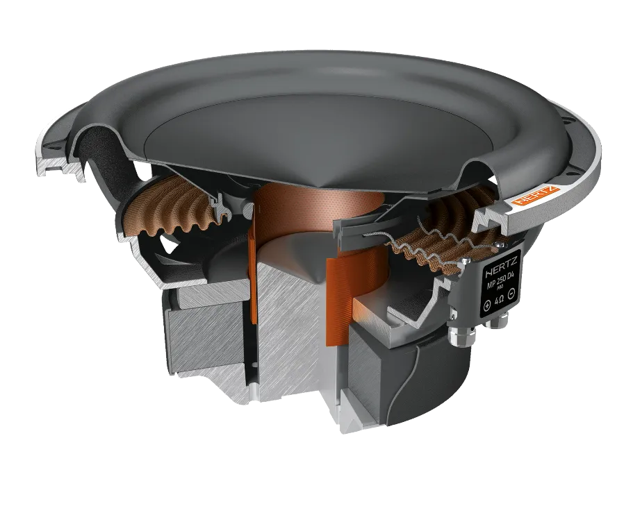 Выдающиеся характеристики при компактном размере – это цель автомобильных сабвуферов Mille Pro. Благодаря своим Используя ноу-хау, приобретенные в Mille Legend , команда НИОКР оптимизировала производственный процесс, чтобы предложить «Hertz Sound Experience» более широкой аудитории, используя часть технологий и материалов флагманской линейки. МП 250 Д4.3 Конус изготовлен методом прессования бумажной массы с добавлением минеральных порошков. Такая же технология изготовления используется для Legend. V-cone® Профиль увеличивает жёсткость, позволяя конусу работать как поршень. Материалы окружающего материала изготовлены из высокочистого материала. Изготовлены из бутилкаучука IIR . Как и модели Legend ML2000.3 и ML2500.3, сабвуферы Mille PRO изготовлены с использованием технологии Boundary Free Surround, которая обеспечивает большую площадь звучания при одинаковом диаметре и более высокое звуковое давление. Компактный 6-спицевый алюминиевый сплав антирезонансный Корзина такая же, как у топовой модели ML 2500.3, и способствует механическому демпфированию сабвуфера, будучи абсолютно прозрачной для звука. 65-мм 4-слойная звуковая катушка выше 60 мм и намотан на формовщик TIL-P, что обеспечивает высокое линейное перемещение. Конфигурация импеданса DVC 4 Ом + 4 Ом повышает универсальность и позволяет согласовать усилители с любой системой. Система воздушного охлаждения и декомпрессии устраняет необходимость в центральном отверстии в нижней пластине, что даёт три преимущества: