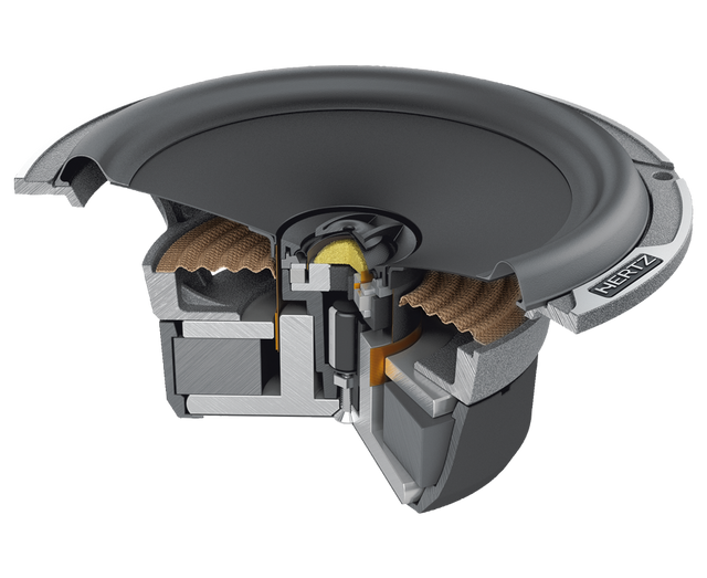 7. КОРЗИНА: небольшая монтажная глубина, акустически прозрачная корзина из алюминиевого сплава с элегантной алмазной огранкой и алюминиевым логотипом Hertz.