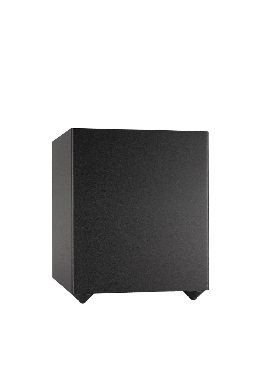 Этот активный сабвуфер понравится не только любителям домашнего кинотеатра, но и меломанам. Он оснащен двумя портами фазоинвертора, расположенными в задней части корпуса, для снижения слышимости нежелательных шумов. Очень низкая частота настройки не допускает чрезмерного отклонения 275-миллиметрового НЧ-динамика. Для углубления басов он был установлен снизу (звук направлен в пол).