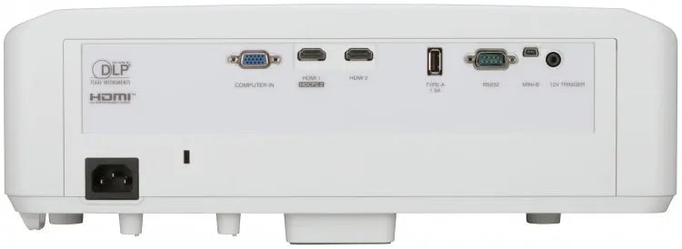 - Разъемы: вход для ПК, HDMI 1 с поддержкой HDCP2.2, HDMI 2, USB Mini B, триггер (12 В), USB Mini A (питание 1,5 А) и RS-232