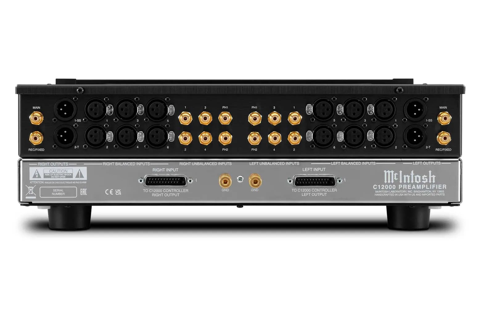 Для подключения C12000 к усилителю(ям) и остальной домашней музыкальной системе предусмотрены четыре выхода: один балансный ламповый; один балансный транзисторный; один фиксированный небалансный; и один программируемый небалансный (может быть как ламповым, так и транзисторным). Объём пользовательских настроек, доступных на двух входах для проигрывателя фонокорректора и всех выходах, представляет собой новый уровень настройки предусилителей McIntosh, обеспечивая максимальную гибкость в настройке вашей аудиосистемы.