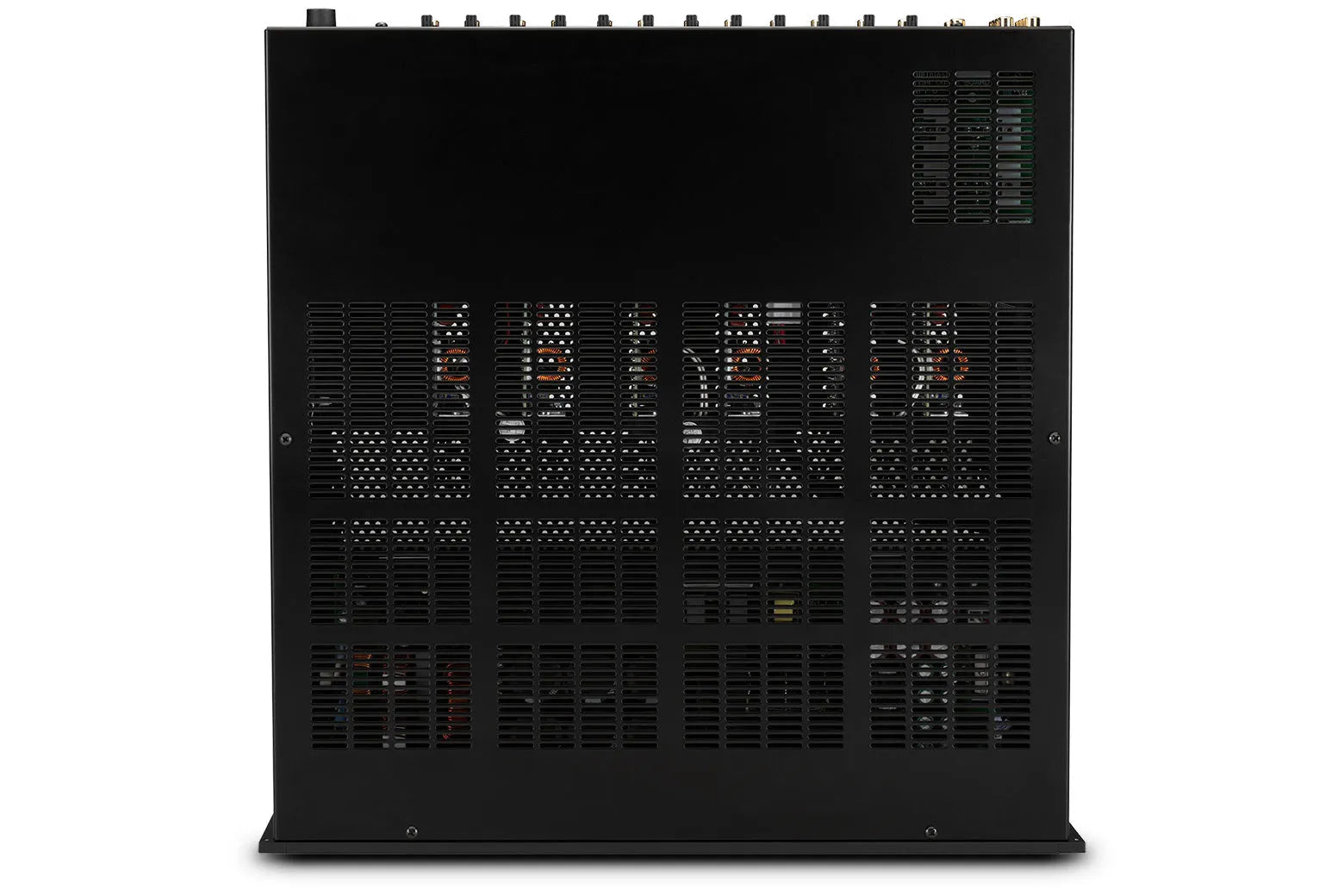 На задней панели расположены небалансные входы и двухполюсные клеммы для подключения динамиков Phoenix для каждого канала. Также на задней панели расположены регуляторы громкости для балансировки, два цифровых аудиовхода (коаксиальный или оптический), которые можно объединить в шину, и схемы суммирования каналов для удобного распределения моносигнала.