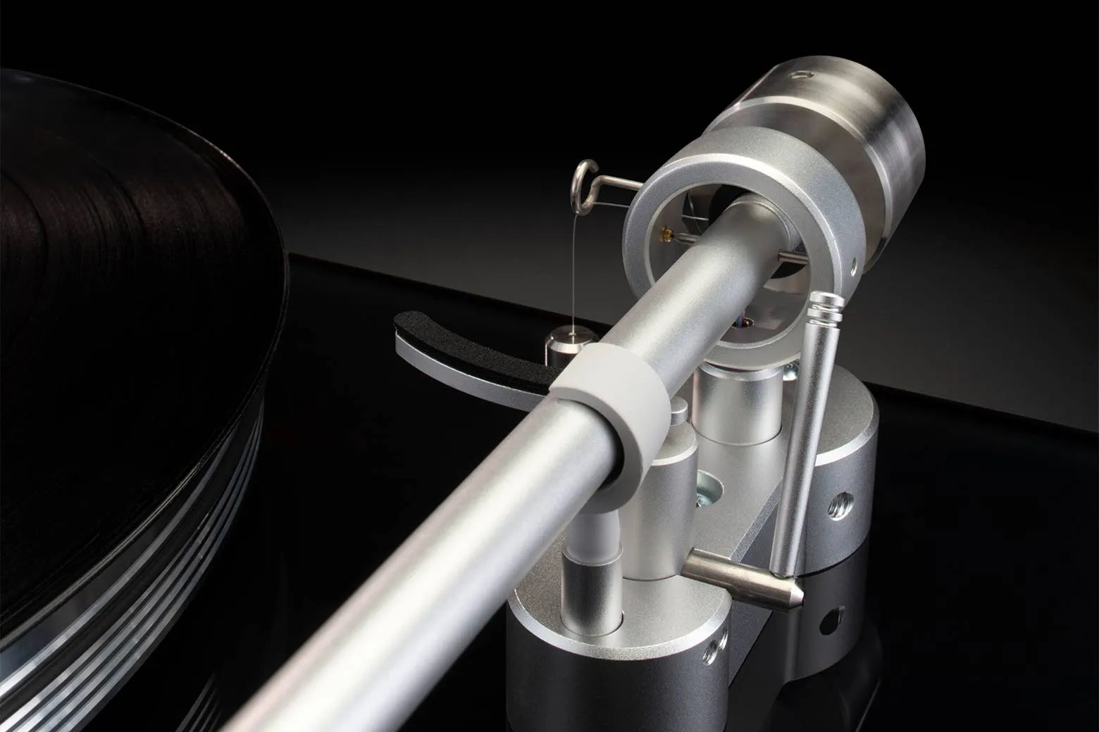 Опорный диск весом 7 фунтов (3,18 кг) из обработанного алюминия расположен в верхней части устройства. Он и соответствующий тонарм из обработанного алюминия с антискатывающей системой установлены на стеклянной пластине толщиной 3/8 дюйма (9,5 мм) – той же, что используется в передних панелях наших более крупных усилителей. Опорный диск, в свою очередь, установлен на специальной металлической пластине толщиной 1/4 дюйма (6,35 мм), которая обеспечивает устойчивость. Сочетание массивности опорного диска и металлической пластины помогает поглощать шум, возникающий из-за внешних вибраций.