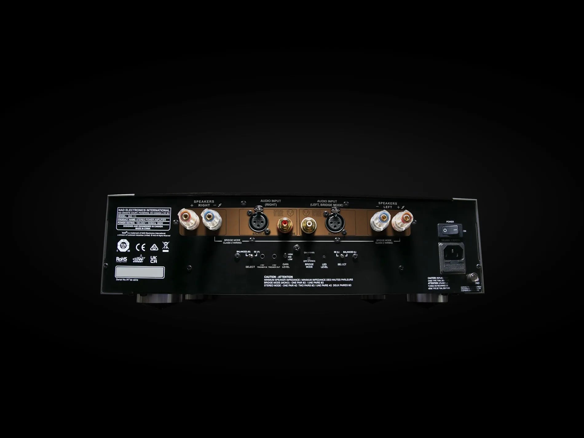 Оснащенный однотактными RCA и балансными XLR стереовходами с автоматическим определением усиления, трехпозиционным переключателем регулировки усиления и интеллектуальным 12-вольтовым триггерным входом и выходом, стереоусилитель мощности NAD M23 V2 может быть легко интегрирован в высокопроизводительную отдельную систему, особенно в паре с предусилителем NAD M66 BluOS Streaming DAC. M23 V2 также может работать в мостовом режиме, обеспечивая 700 Вт непрерывной мощности на 8 Ом. Для тех, кто собирает мощную систему, два усилителя M23 V2 могут быть объединены в мостовом режиме со встроенной в 12-вольтовый триггерный выход задержкой в одну секунду для предотвращения скачков напряжения. Слушатели также могут объединить M23 V2 с интегрированным усилителем NAD M33 V2 в мостовом режиме, создав внушительную установку с 700 Вт на канал — идеальную для энтузиастов потокового вещания Hi-Fi, ищущих мощность и управление с возможностями потоковой передачи BluOS.