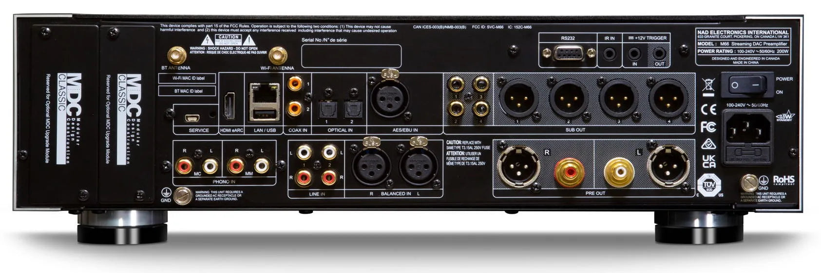 Masters M66 представляет собой вершину современных технических возможностей двухканального предусилителя и сохранит своё технологическое лидерство ещё долгие десятилетия. На задней панели расположены два слота расширения с поддержкой MDC2 — новейшего поколения модульной конструкции NAD, ориентированной на будущее. По мере развития технологий владельцы M66 смогут добавлять новые возможности, просто вставив модуль MDC2 в один из слотов.